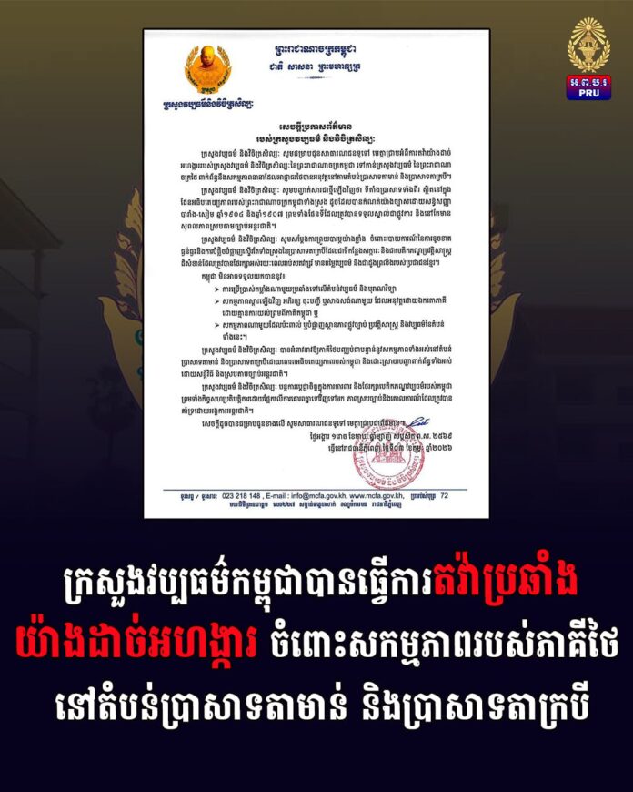 នៅថ្ងៃទី៣ ខែកុម្ភៈ ឆ្នាំ២០២៦ ក្រសួងវប្បធម៌ និងវិចិត្រសិល្បៈ បានធ្វើការតវ៉ាយ៉ាងដាច់អហង្ការចំពោះក្រសួងវប្បធម៌ថៃ ដែលពាក់ព័ន្ធនឹងសកម្មភាពនានាដែលអាជ្ញាធរថៃបានអនុវត្តនៅតាមតំបន់ប្រាសាទតាមាន់ និងប្រាសាទតាក្របី ដែលប្រាសាទទាំងពីរនេះស្ថិតនៅក្នុងដែនអធិបតេយ្យភាពរបស់ប្រទេសកម្ពុជាទាំងស្រុង ដូចដែលបានកំណត់យ៉ាងច្បាស់ដោយសន្ធិសញ្ញ បារាំង-សៀម ឆ្នាំ១៩០៤ និងឆ្នាំ១៩០៧ ព្រមទាំងផែនទីដែលត្រូវបានទទួលស្គាល់ជាផ្លូវការ និងនៅតែមានសុពលភាពស្របតាមច្បាប់អន្តរជាតិ។