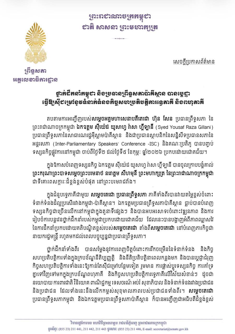 សេចក្តីប្រកាសព័ត៌មានស្តីពី លទ្ធផលនៃដំណើរទស្សនកិច្ចផ្លូវការរបស់ឯកឧត្តម ស៊ីយ៉េដ យូសាហ្វ រ៉ាសា ហ្គីឡានី ប្រធានព្រឹទ្ធសភានៃសាធារណរដ្ឋអ៊ីស្លាមប៉ាគីស្ថាន នៅព្រះរាជាណាចក្រកម្ពុជា ពីថ្ងៃទី២-៥ ខែកុម្ភៈ ឆ្នាំ២០២៦