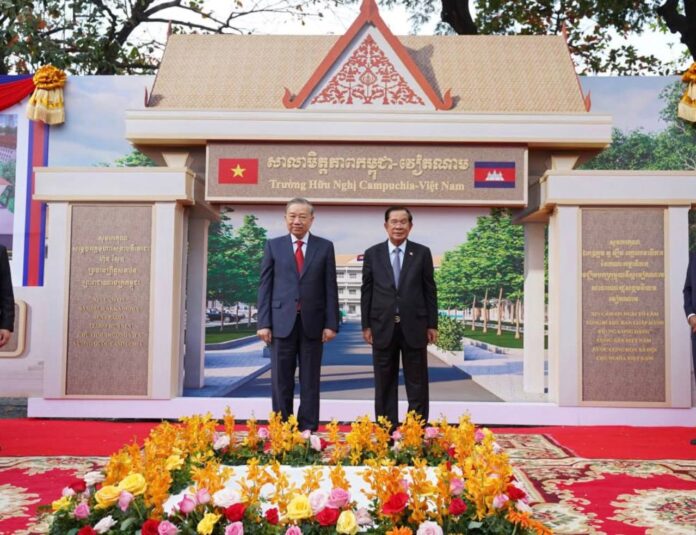 នាល្ងាចថ្ងៃទី៦ ខែកុម្ភៈ ឆ្នាំ២០២៦ សម្ដេចអគ្គមហាសេនាបតីតេជោ ហ៊ុន សែន ប្រធានព្រឹទ្ធសភា នៃព្រះរាជាណាចក្រកម្ពុជា និងឯកឧត្តម តូ ឡឹម អគ្គលេខាធិការនៃគណៈកម្មាធិការមជ្ឈិមបក្សកុម្មុយនីស្តវៀតណាម បានអញ្ជើញជាអធិបតីតីដ៏ខ្ពង់ខ្ពស់ក្នុងពិធី “បញ្ចុះបឋមសិលាសាងសង់សាលាមិត្តភាពកម្ពុជា-វៀតណាម” ស្ថិតក្នុងខណ្ឌដង្កោ រាជធានីភ្នំពេញ។