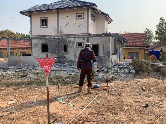 សូមរម្លឹកថា សង្រ្គាមឈ្លានពានរបស់កងកម្លាំងថៃមកលើដែនអធិបតេយ្យភាពកម្ពុជា បានបន្សល់ទុកនូវអាវុធយុទ្ធភណ្ឌមិនទាន់ផ្ទុះ រួមទាំងគ្រាប់បែកចង្កោមយ៉ាងច្រើន នៅតាមតំបន់ស៊ីវិលជាច្រើន ដែលរារាំងដល់ការត្រលប់មកកាន់លំនៅឋានវិញរបស់ជនភៀសសឹក។