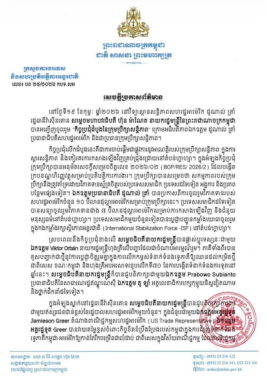 សេចក្តីប្រកាសព័ត៌មាន ស្តីពី លទ្ធផលនៃការអញ្ជើញចូលរួម របស់ សម្ដេចធិបតីនាយករដ្ឋមន្រ្ដី ក្នុងកិច្ចប្រជុំដំបូងនៃក្រុមប្រឹក្សាសន្តិភាព 22 February, 2026 ចែករំលែក FacebookTwitterTelegramWhatsAppEmail ពត៌មានទាក់ទង វិចារណកថា៖ ផលិតកម្មបៃតង (Green Manufacturing) សសរស្តម្ភ... ប្រមុខរដ្ឋស្តីទីក្នុងព្រះបរមនាម ព្រះករុណា ព្រះមហាក្សត្រ... ខ្លឹមសារ Press Briefing របស់ឯកឧត្តម ប៉ែន បូណា ប្រធានអង្... ប្រធានក្រុមអ្នកនាំពាក្យរបស់នាយករដ្ឋមន្រ្តី បញ្ជាក់ពីដំណ... វិចារណកថា! កោះបៃតងតាមស្តង់ដារ IUCN៖ សមតុល្យរវាងការអភិរក... វិចារណកថា៖ ផ្កាថ្មប៉ប្រះទឹក និងការប្រែប្រួលអាកាសធាតុ Press OCM - អង្គភាពព័ត៌មាន និងប្រតិកម្មរហ័ស ពត៌មានផ្សេងៗ វិចារណកថា! កោះបៃតងតាមស្តង់ដារ IUCN៖ សមតុល្យរវាងការអភិរក្ស និងការអភិវឌ្ឍ 6 April, 2026 ការប្រែក្លាយកោះឱ្យទៅជា «កោះបៃតង» តាមស្តង់ដាររបស់សហភាពអន្តរជាតិ ដើម្បីការអភិរក្សធម្មជាតិ International Union for Conservation of Nature (IUCN) វិចារណកថា៖ ផ្កាថ្មប៉ប្រះទឹក និងការប្រែប្រួលអាកាសធា... 6 April, 2026 សម្តេចបវរធិបតី ហ៊ុន ម៉ាណែត ចេញសារលិខិតអបអរសាទរ ក្ន... 6 April, 2026 ឯកឧត្តមនាយឧត្តមសេនីយ៍ ឥត សារ៉ាត់ ចុះសួរសុខទុក្ខយោធ... 3 April, 2026