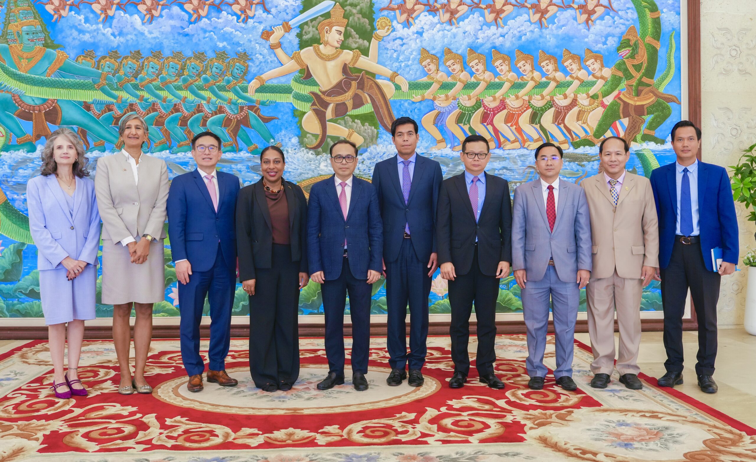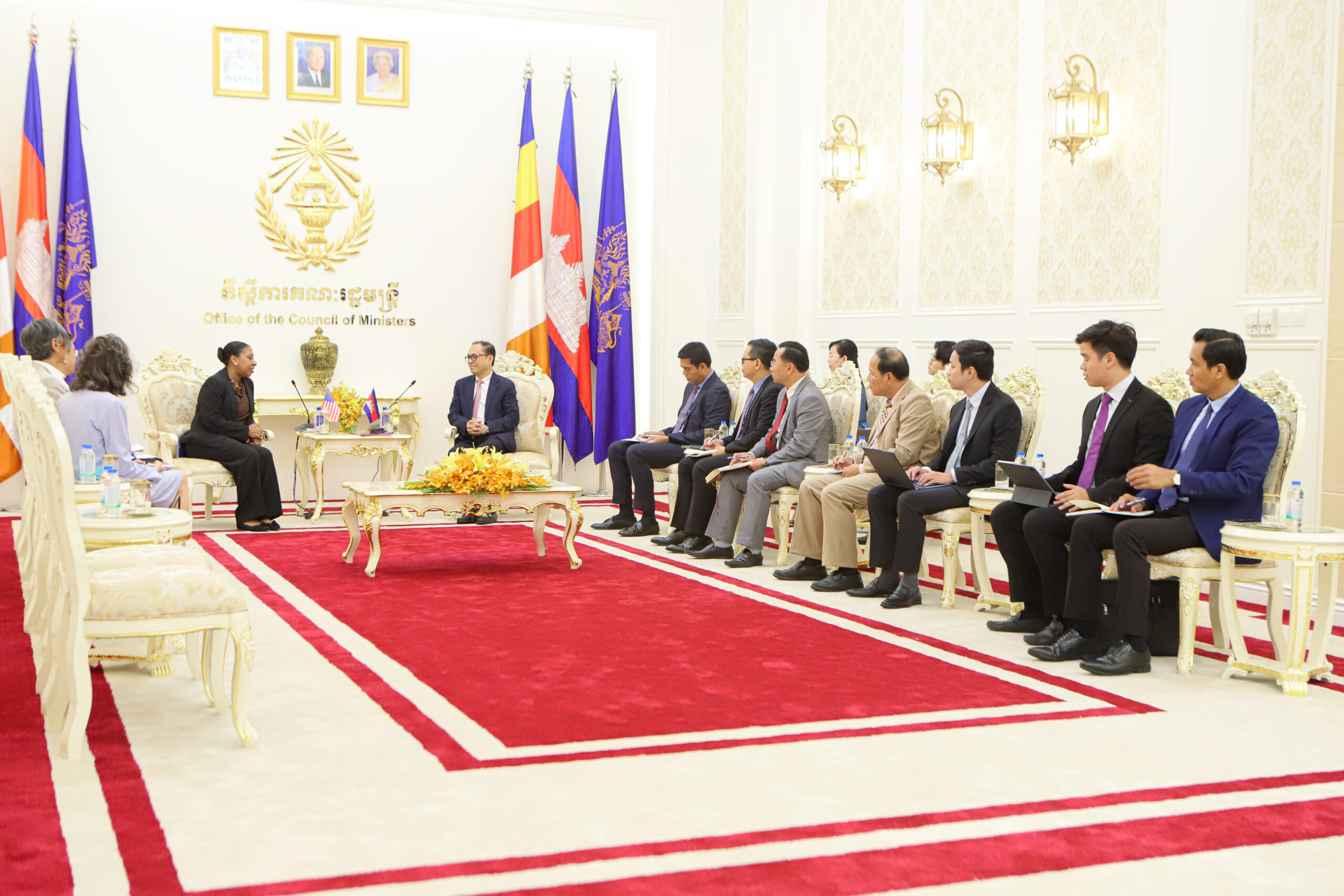 (ភ្នំពេញ)៖ នាព្រឹកថ្ងៃទី៣ ខែមីនា ឆ្នាំ២០២៦ ឯកឧត្តម វង្សី វិស្សុត ឧបនាយករដ្ឋមន្ត្រីប្រចាំការ រដ្ឋមន្ត្រីទទួលបន្ទុកទីស្ដីការគណៈរដ្ឋមន្ត្រី ទទួលជួបពិភាក្សាការងារជាមួយលោកជំទាវ Bridgette Walker ភារធារីស្តីទីនៃស្ថានទូតសហរដ្ឋអាម៉េរិកប្រចាំនៅកម្ពុជាអមដោយមន្រ្តីជាន់ខ្ពស់ នៅទីស្តីការគណៈរដ្ឋមន្ត្រី ដើម្បីពិភាក្សាអំពីការពង្រឹងទំនាក់ទំនងទេ្វភាគីលើវិស័យពាណិជ្ជកម្ម ធុរកិច្ច ការទូត និងសន្តិសុខ រវាងប្រទេសកម្ពុជានិងសហរដ្ឋអាម៉េរិក និងកិច្ចសហប្រតិបត្តិការក្នុងវិស័យសំខាន់ៗដែលមានសក្តានុពលសម្រាប់ប្រទេសទាំងពីរ។
