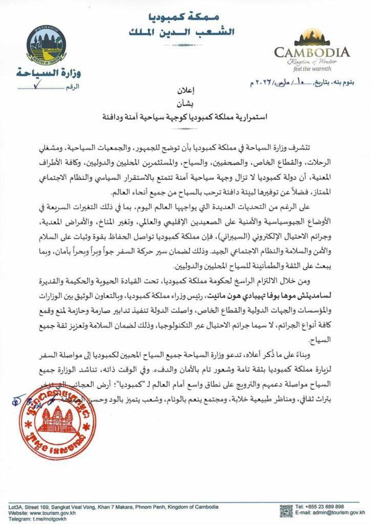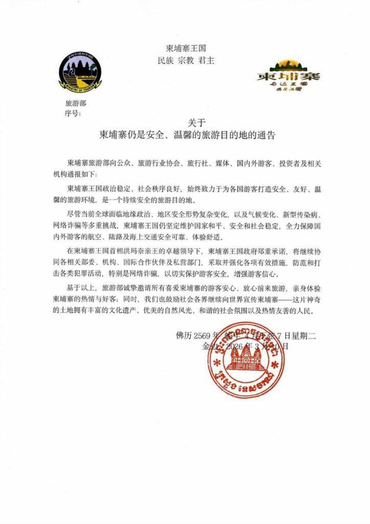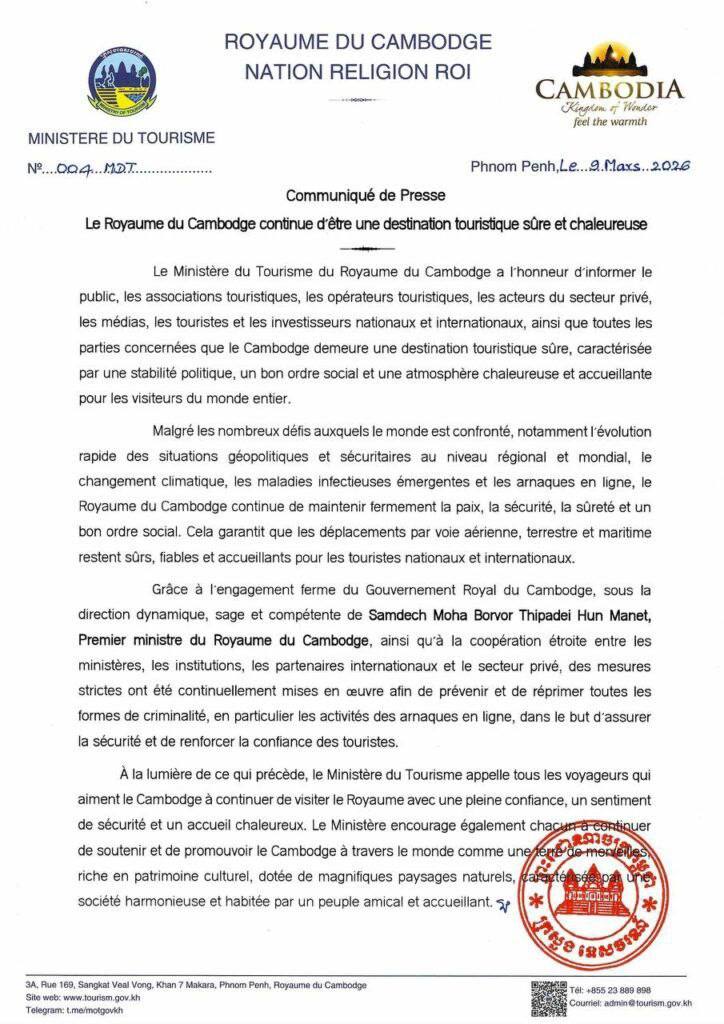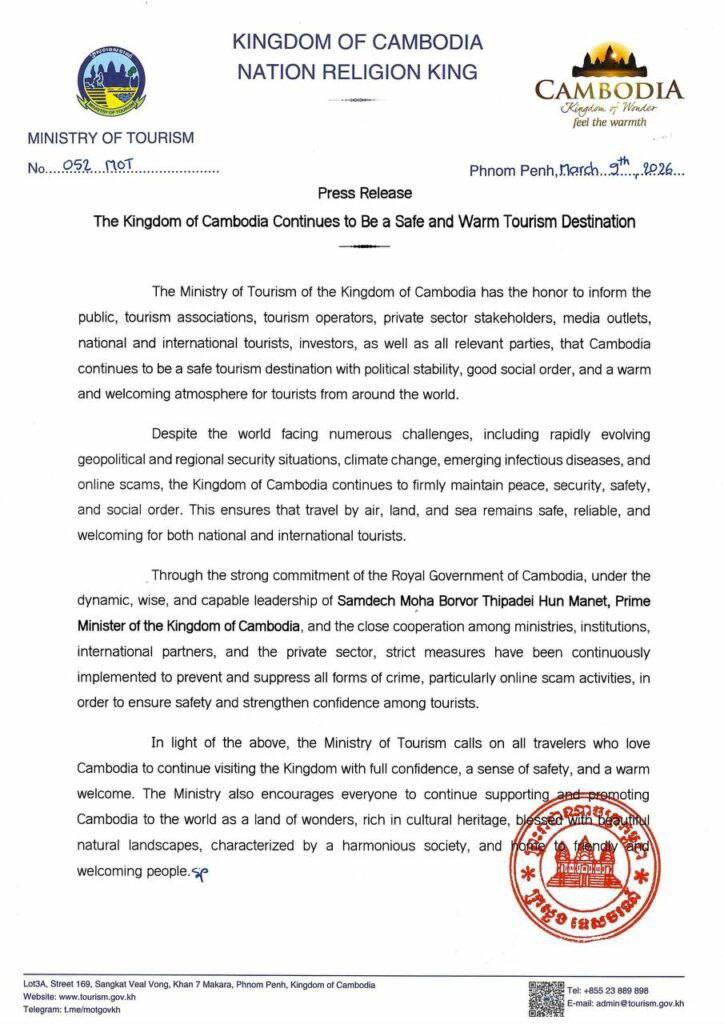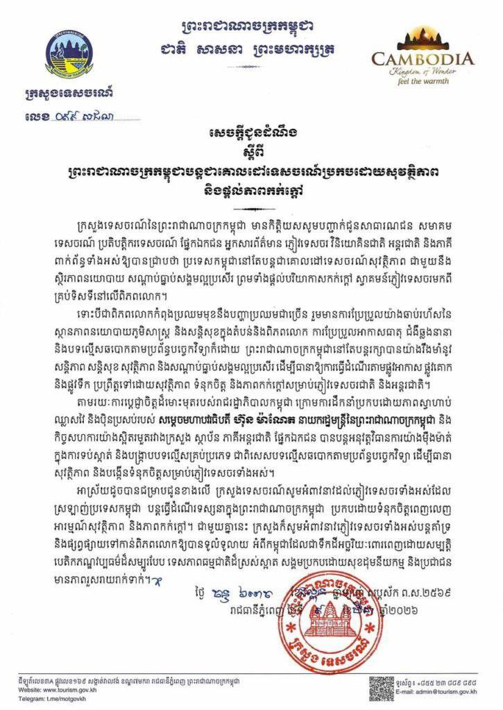 យោងតាមសេចក្តីជូនដំណឹងរបស់ក្រសួងទេសចរណ៍ចុះថ្ងៃទី៩ ខែមីនា ឆ្នាំ២០២៦ បានឱ្យដឹងថា ប្រទេសកម្ពុជានៅតែបន្តជាគោលដៅទេសចរណ៍សុវត្ថិភាព ជាមួយនឹងស្ថិរភាពនយោបាយ សណ្តាប់ធ្នាប់សង្គមល្អប្រសើរ ព្រមទាំងផ្តល់បរិយាកាសកក់ក្ដៅ ស្វាគមន៍ភ្ញៀវទេសចរមកពីគ្រប់ទិសទីនៅលើពិភពលោក។ នេះបើយោងតាមការបញ្ជាក់របស់ក្រសួងទេសចរណ៍នៃព្រះរាជាណាចក្រកម្ពុជា។