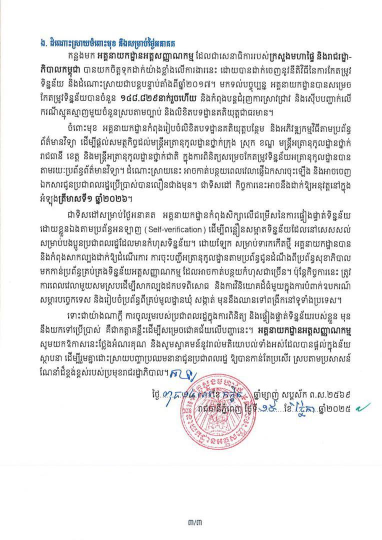 ជាមួយគ្នានេះ អគ្គនាយកដ្ឋានអត្តសញ្ញាណកម្ម បានលើកទឹកចិត្តឲ្យប្រជាពលរដ្ឋធ្វើការផ្ទៀងផ្ទាត់ព័ត៌មានដោយខ្លួនឯងជាប្រចាំ (Self-verification) និងរាយការណ៍កំហុសភ្លាមៗ ប្រសិនបើរកឃើញ។ វិធានការនេះមានសារៈសំខាន់ក្នុងការកាត់បន្ថយកំហុស និងបង្កើនភាពជឿជាក់នៃប្រព័ន្ធទិន្នន័យអត្តសញ្ញាណជាតិ៕