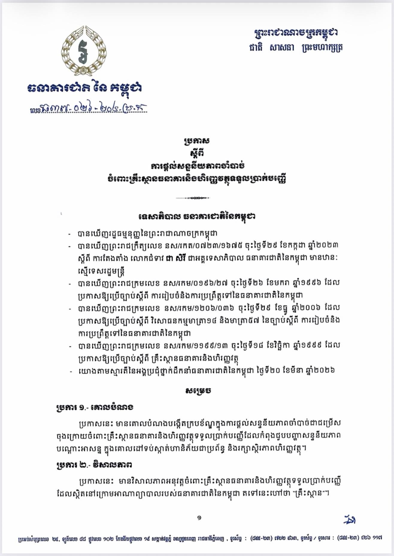 ធនាគារជាតិ នៃកម្ពុជា | ប្រកាស ស្តីពីការផ្តល់សន្ទនីយភាពចាំបាច់ ចំពោះគ្រឹះស្ថានធនាគារ និងហិរញ្ញវត្ថុទទួលប្រាក់បញ្ញើ 21 March, 2026 ចែករំលែក FacebookTwitterTelegramWhatsAppEmail ពត៌មានទាក់ទង វិចារណកថា៖ ផលិតកម្មបៃតង (Green Manufacturing) សសរស្តម្ភ... ប្រមុខរដ្ឋស្តីទីក្នុងព្រះបរមនាម ព្រះករុណា ព្រះមហាក្សត្រ... ខ្លឹមសារ Press Briefing របស់ឯកឧត្តម ប៉ែន បូណា ប្រធានអង្... ប្រធានក្រុមអ្នកនាំពាក្យរបស់នាយករដ្ឋមន្រ្តី បញ្ជាក់ពីដំណ... វិចារណកថា! កោះបៃតងតាមស្តង់ដារ IUCN៖ សមតុល្យរវាងការអភិរក... វិចារណកថា៖ ផ្កាថ្មប៉ប្រះទឹក និងការប្រែប្រួលអាកាសធាតុ Press OCM - អង្គភាពព័ត៌មាន និងប្រតិកម្មរហ័ស ពត៌មានផ្សេងៗ វិចារណកថា! កោះបៃតងតាមស្តង់ដារ IUCN៖ សមតុល្យរវាងការអភិរក្ស និងការអភិវឌ្ឍ 6 April, 2026 ការប្រែក្លាយកោះឱ្យទៅជា «កោះបៃតង» តាមស្តង់ដាររបស់សហភាពអន្តរជាតិ ដើម្បីការអភិរក្សធម្មជាតិ International Union for Conservation of Nature (IUCN) វិចារណកថា៖ ផ្កាថ្មប៉ប្រះទឹក និងការប្រែប្រួលអាកាសធា... 6 April, 2026 សម្តេចបវរធិបតី ហ៊ុន ម៉ាណែត ចេញសារលិខិតអបអរសាទរ ក្ន... 6 April, 2026 ឯកឧត្តមនាយឧត្តមសេនីយ៍ ឥត សារ៉ាត់ ចុះសួរសុខទុក្ខយោធ... 3 April, 2026