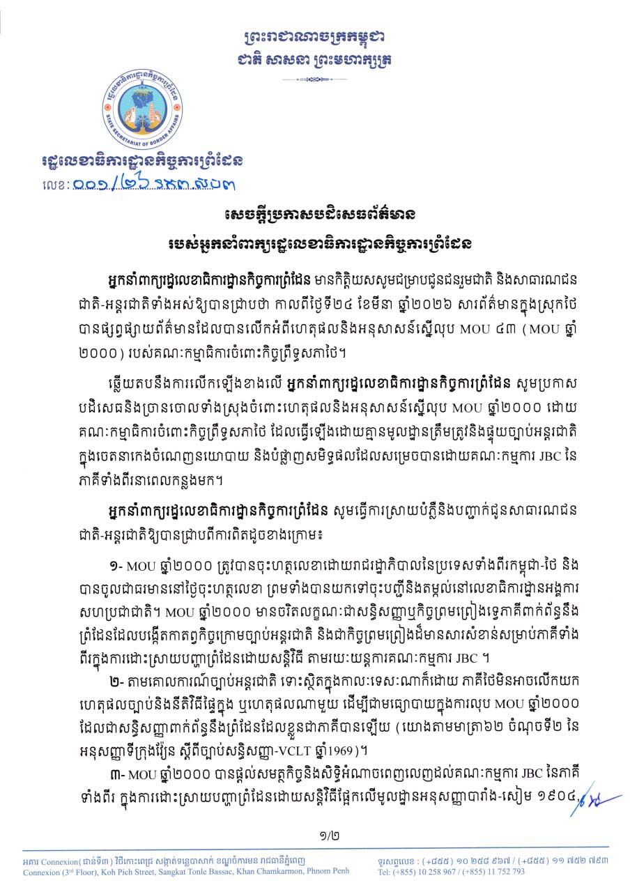 សេចក្ដីប្រកាសបដិសេធព័ត៌មានរបស់អ្នកនាំពាក្យរដ្ឋលេខាធិការដ្ឋានកិច្ចការព្រំដែន ចុះថ្ងៃទី២៦ ខែមីនា ឆ្នាំ២០២៦