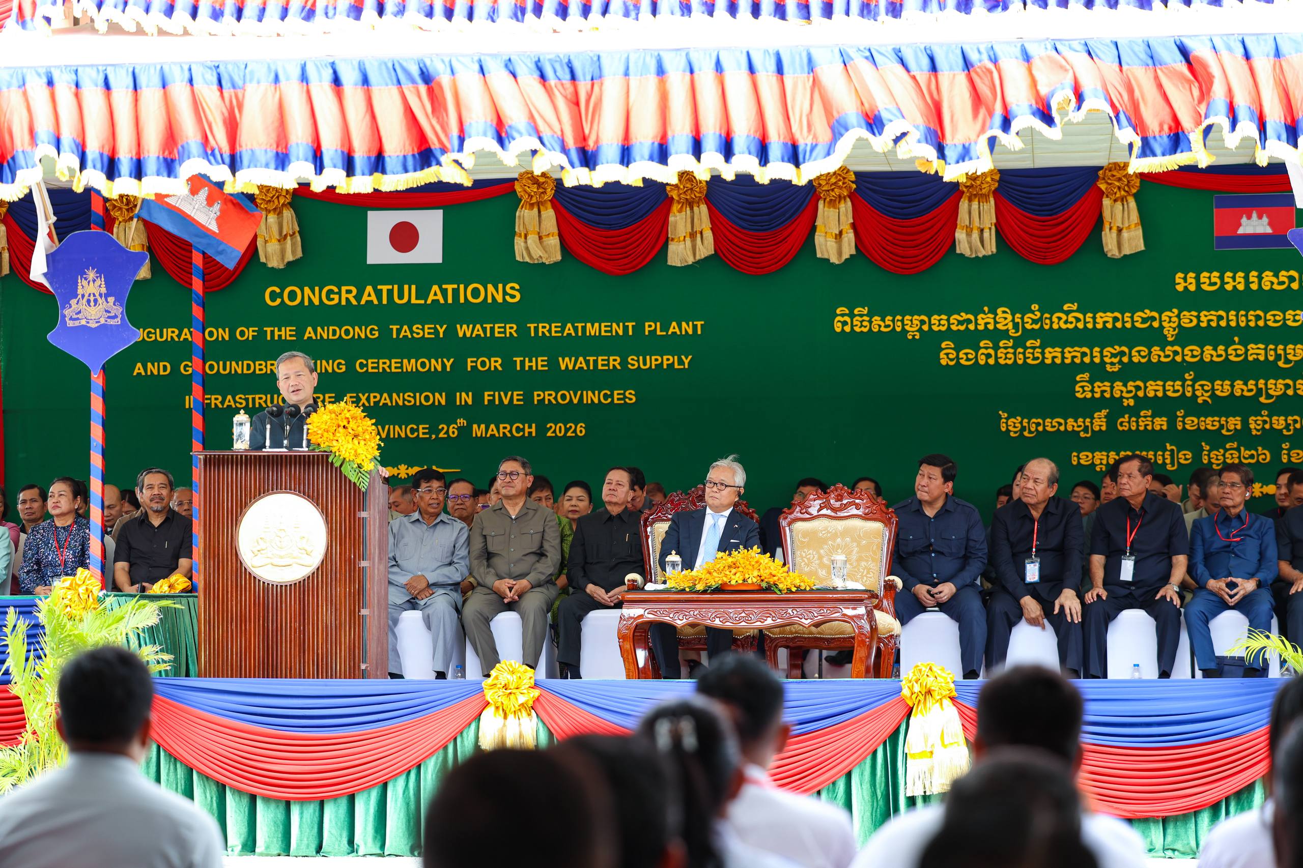 សម្ដេចធិបតីនាយករដ្ឋមន្ត្រី បានថ្លែងដូចនេះ នៅព្រឹកថ្ងៃទី២៦ ខែមីនា ឆ្នាំ២០២៦ ក្នុងឱកាសអញ្ជើញសម្ពោធដាក់ឲ្យប្រើប្រាស់រោងចក្រប្រព្រឹត្តកម្មទឹកស្អាតក្រុងស្វាយរៀង និងបើកការដ្ឋានសាងសង់គម្រោងពង្រីកហេដ្ឋារចនាសម្ព័ន្ធទឹកស្អាត ក្នុងខេត្តចំនួន៥ គឺខេត្តស្វាយរៀង ពោធិ៍សាត់ កំពង់ធំ កំពត និងខេត្តមណ្ឌលគិរី ដែលជាគម្រោងហិរញ្ញប្បទានដោយថវិកាជាតិ។