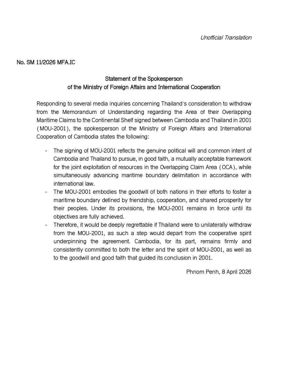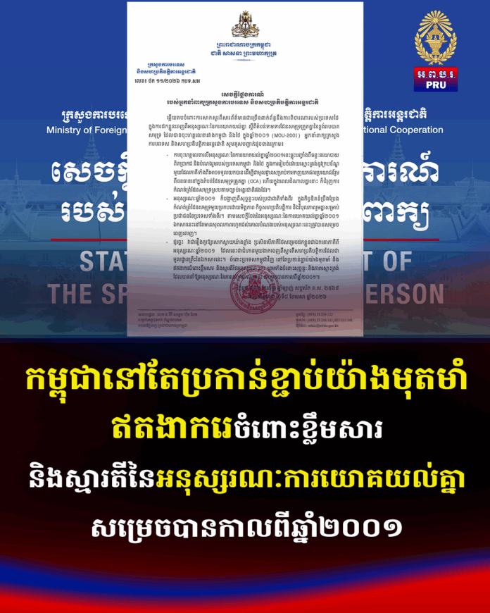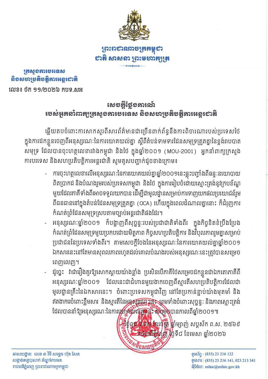យោងតាមសេចក្តីថ្លែងការណ៍របស់អ្នកនាំពាក្យក្រសួងការបរទេស និងសហប្រតិបត្តិការអន្តរជាតិនៅថ្ងៃទី៨ ខែមេសា ឆ្នាំ២០២៦ បានឲ្យដឹងថា ឆ្លើយតបចំពោះការសាកសួរពីសារព័ត៌មានជាច្រើនពាក់ព័ន្ធនឹងការពិចារណារបស់ប្រទេសថៃ ក្នុងការដកខ្លួនចេញពីអនុស្សរណៈនៃការយោគយល់គ្នា ស្តីពីតំបន់ទាមទារដែនសមុទ្រត្រួតគ្នានៃខ្ពង់រាបបាត សមុទ្រ ដែលបានចុះហត្ថលេខារវាងកម្ពុជា និងថៃ ក្នុងឆ្នាំ២០០១ (MOU-2001) អ្នកនាំពាក្យក្រសួង ការបរទេស និងសហប្រតិបត្តិការអន្តរជាតិ សូមគូសបញ្ជាក់ដូចខាងក្រោម៖