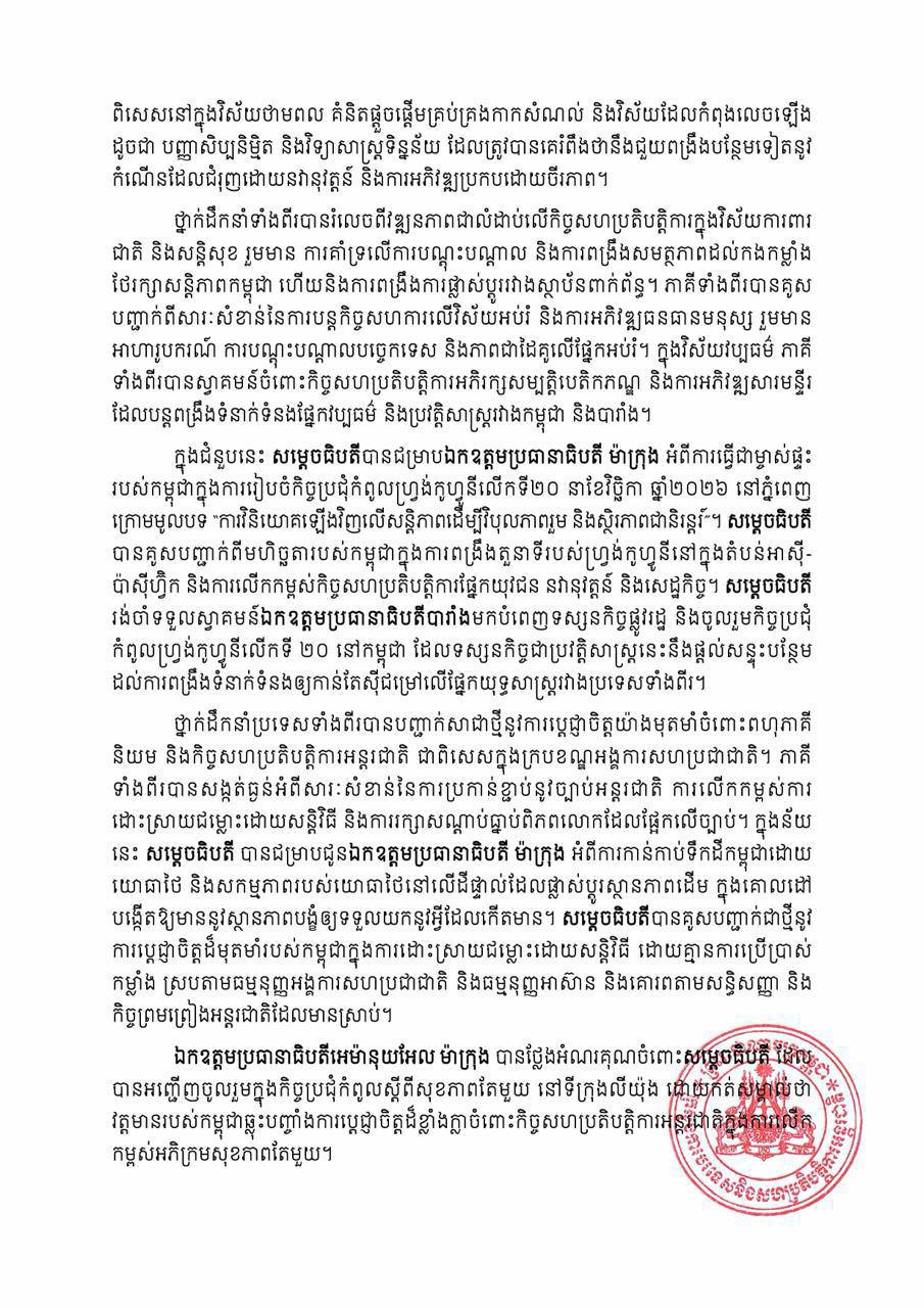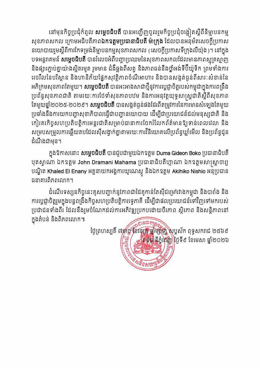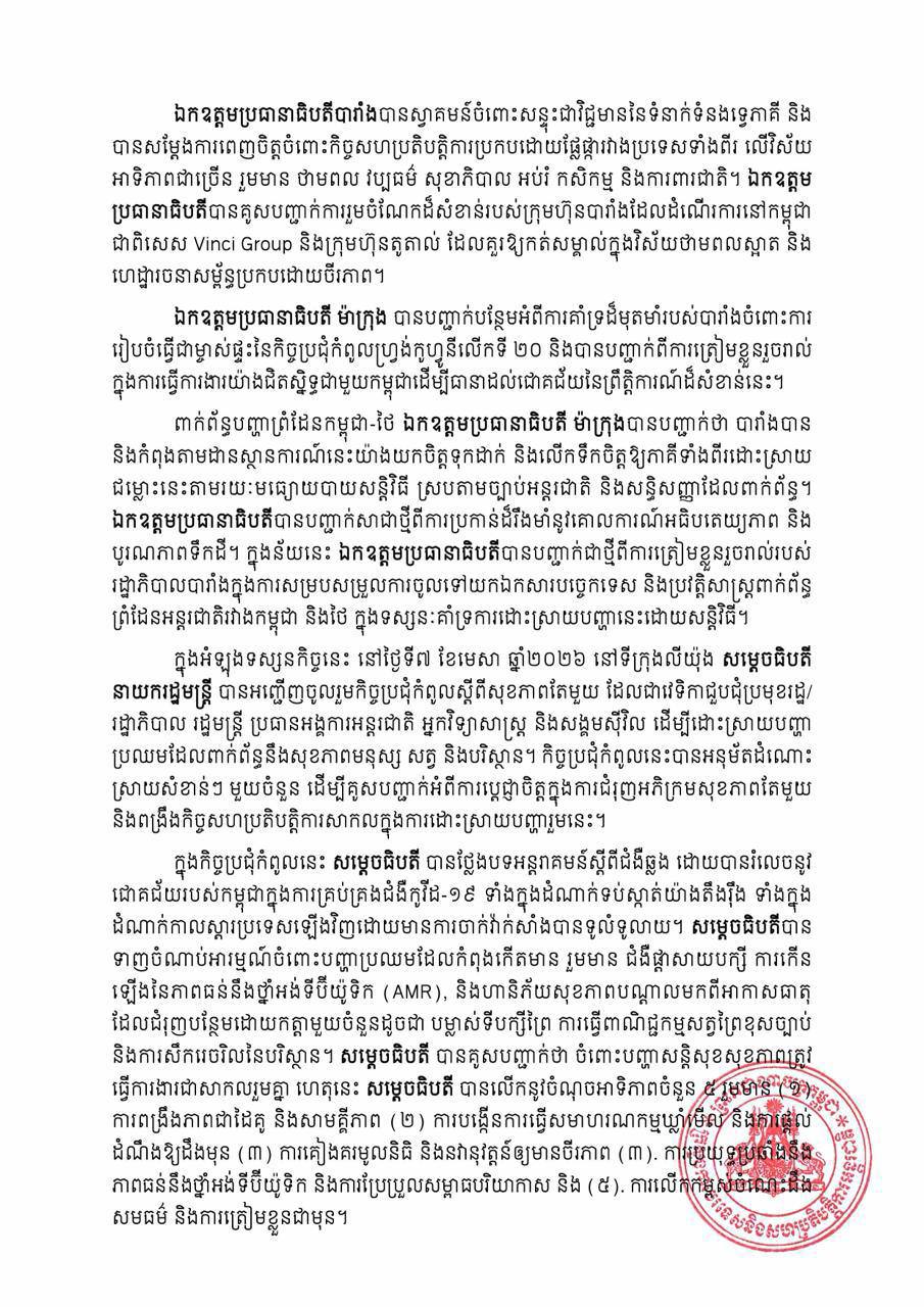 សេចក្ដីប្រកាសព័ត៌មាន ស្ដីពីលទ្ធផលនៃទស្សនកិច្ចការងាររបស់សម្ដេចធិបតីនាយករដ្ឋមន្រ្ដី នៅសាធារណរដ្ឋបារាំង