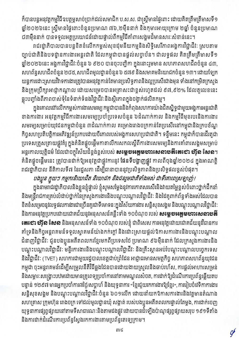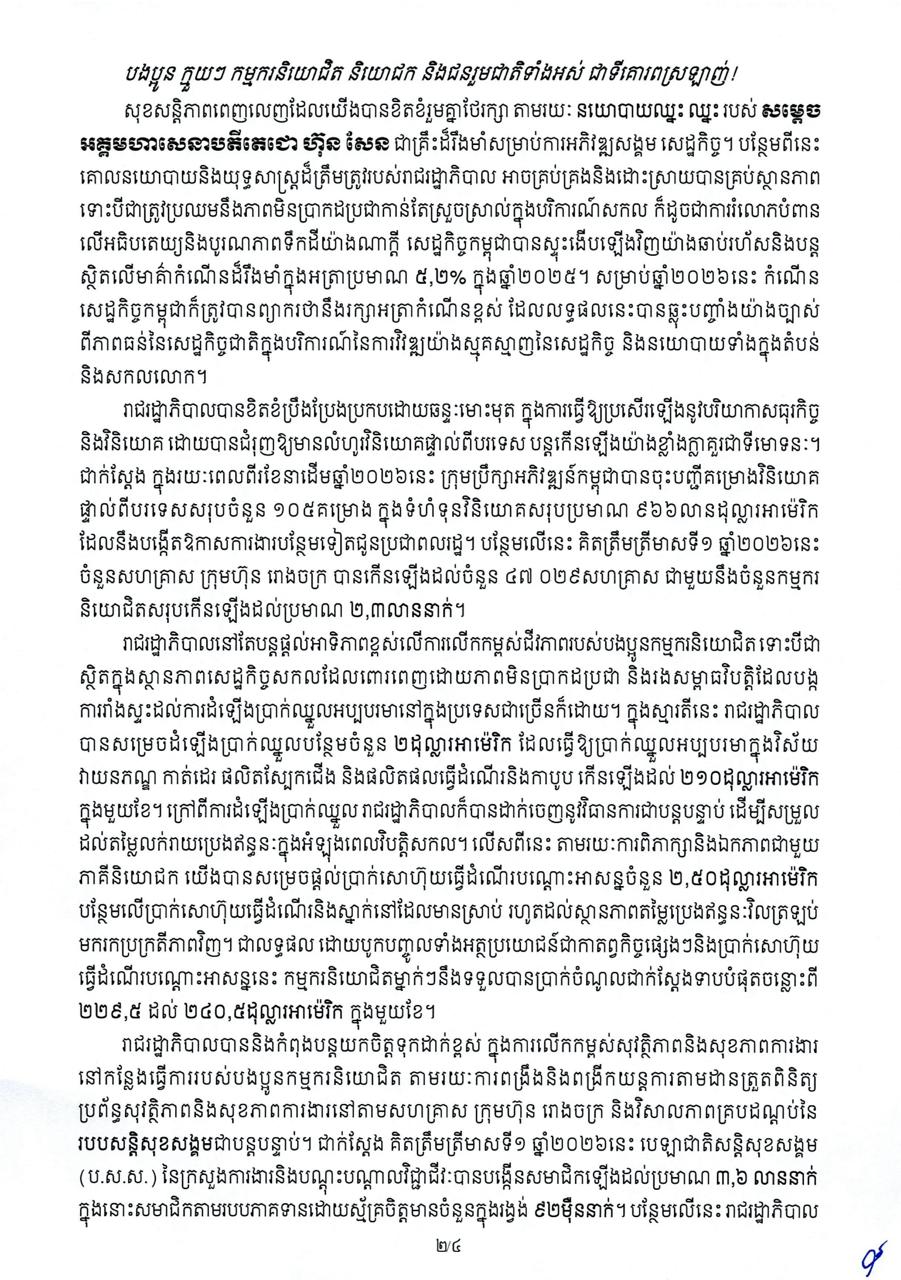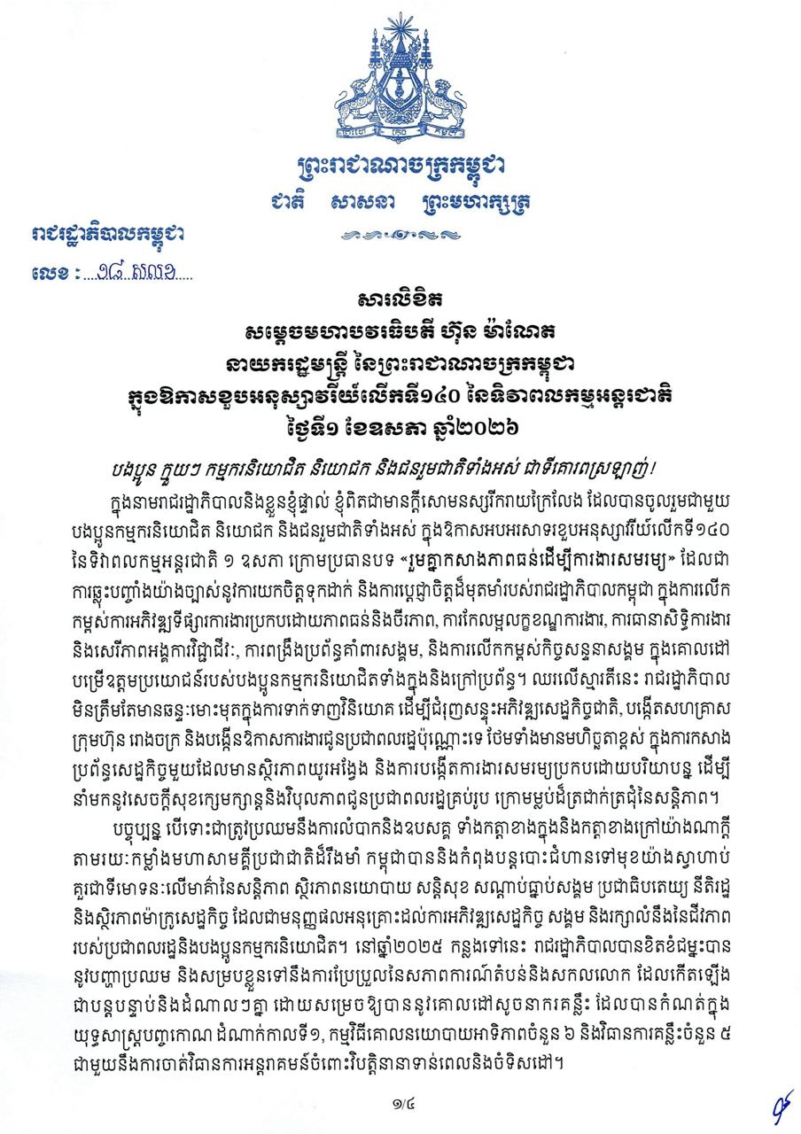 សារលិខិត សម្តេចមហាបវរធិបតី ហ៊ុន ម៉ាណែត ក្នុងឱកាសខួបអនុស្សាវរីយ៍លើកទី១៤០ នៃទិវាពលកម្មអន្តរជាតិ ថ្ងៃទី១ ខែឧសភា ឆ្នាំ២០២៦