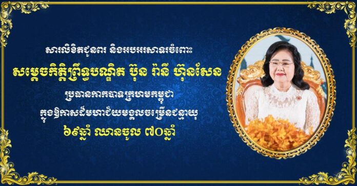 ក្នុងឱកាសដ៏វិសេសវិសាលថ្លៃថ្លានេះ យើងខ្ញុំទាំងអស់គ្នា សូមសម្តែងនូវការគោរពកោតសរសើរដ៏ស្មោះស្ម័គ្រ និងដឹងគុណយ៉ាងជ្រាលជ្រៅ ប្រកបដោយកតញ្ញូកតវេទិតាធម៌ ចំពោះបញ្ញាញាណដ៏ឈ្លាសវៃ ព្រមទាំងសកម្មភាពប្រកបដោយគុណធម៌ មនុស្សធម៌ និងព្រហ្មវិហារធម៌ របស់សម្តេចកិត្តិព្រឹទ្ធបណ្ឌិត ដែលបានចូលរួមចំណែកយ៉ាងធំធេងជាមួយនឹងរាជរដ្ឋាភិបាលកម្ពុជា ក្នុងការដោះស្រាយទុក្ខលំបាក និងជួយកាត់បន្ថយភាពក្រីក្រ របស់ប្រជាជនគ្រប់ទីកន្លែង ឱ្យមានជីវភាពកាន់តែល្អប្រសើរឡើង។