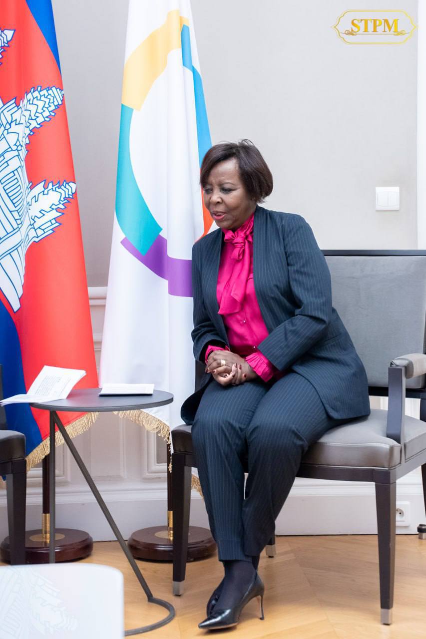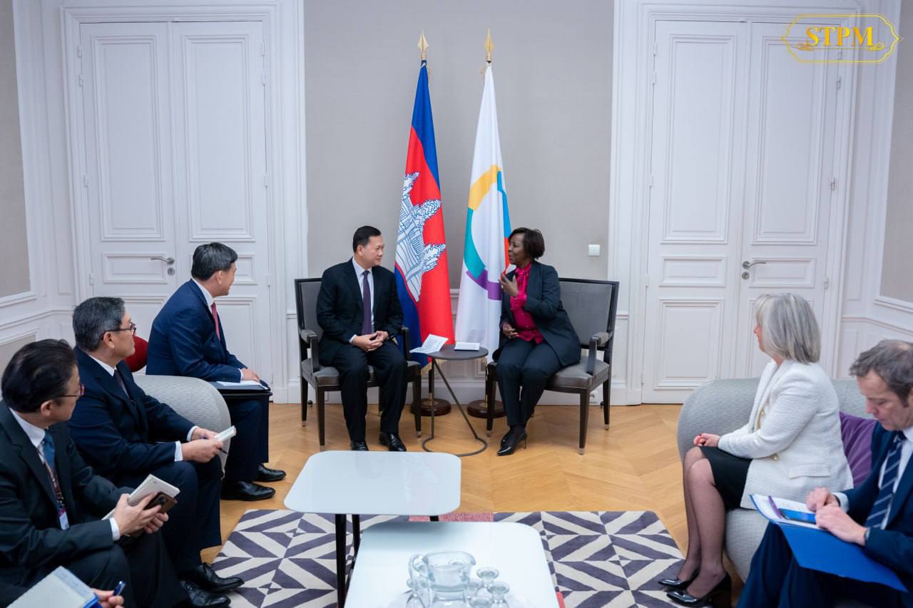 ក្នុងឱកាសនៃជំនួបនេះ លោកជំទាវអគ្គលេខាធិការ បានសម្ដែងនូវការស្វាគមន៍ និងអបអរសាទរសម្តេចធិបតី ដែលត្រូវបានជ្រើសតាំងជានាយករដ្ឋមន្ត្រី នៃព្រះរាជាណាចក្រកម្ពុជា នីតិកាលទី៧ នៃរដ្ឋសភា និងវាយតម្លៃខ្ពស់ចំពោះលទ្ធផលដែលសម្រេចបានរបស់រាជរដ្ឋាភិបាលកម្ពុជា ក្នុងរយៈពេល១០០ថ្ងៃ ព្រមទាំងបានជូនពរដល់សម្ដេចធិបតី ឱ្យទទួលបាននូវភាពជោគជ័យបន្ថែមទៀតជូនជាតិ និងប្រជាជនកម្ពុជា។ ក្នុងជំនួបនេះដែរ លោកជំទាវអគ្គលេខាធិការ បានបង្ហាញនូវការគាំទ្របេក្ខភាពរបស់កម្ពុជាក្នុងការធ្វើជាម្ចាស់ផ្ទះនៃកិច្ចប្រជុំកំពូលហ្វ្រង់កូហ្វូនី នៅឆ្នាំ២០២៦ និងបានស្នើដល់កម្ពុជាបន្តចូលរួមចែករំលែកបទពិសោធន៍របស់កម្ពុជាក្នុងការថែរក្សាស្ថិរភាព សន្ដិភាព ដល់បណ្ដាប្រទេសនិយាយភាសាបារាំងនៅក្នុងទ្វីបអាហ្វ្រិក និងបណ្ដាទ្វីបដទៃទៀត ក៏ដូចជាប្រទេសដែលមិនប្រើប្រាស់ភាសាបារាំងផងដែរ ដែលនេះជាអ្វីដែលកម្ពុជាធ្លាប់បានចែករំលែក និងបង្ហាញភាពល្អប្រសើរក្នុងការរួមចំណែកថែរក្សាសន្ដិភាពក្នុងតំបន់ និងពិភពលោក។ លោកជំទាវក៏បានស្នើដល់កម្ពុជា បន្តការចែករំលែកបទពិសោធន៍ ជាមួយបណ្ដាប្រទេសផ្សេងទៀត ក្នុងបេសកកម្មផ្នែកសេដ្ឋកិច្ច ទេសចរណ៍ និងបេសកកម្មលើផ្នែកសំខាន់ៗផ្សេងទៀត ព្រមទាំងបទពិសោធន៍នៃការថែរក្សាវប្បធម៌នៃការប្រើប្រាស់ភាសាបារាំងផងដែរ។