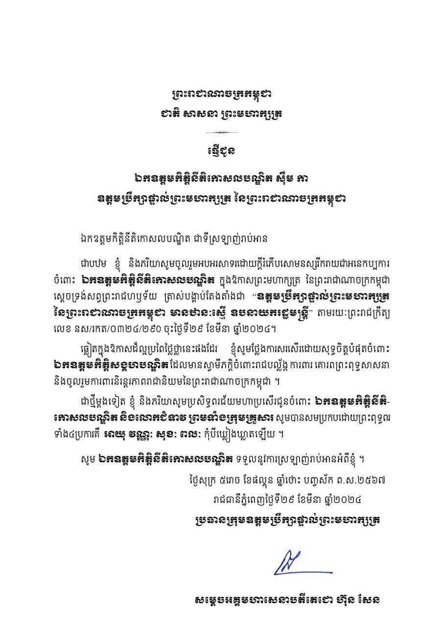 សម្តេចតេជោ ហ៊ុន សែន​ ផ្ញើសារអបអរសាទរ និងជូនពរ ឯកឧត្តមកិត្តិនីតិកោសលបណ្ឌិត ស៊ឹម កា ដែលត្រូវបានព្រះមហាក្សត្រ តែងតាំងជា ឧត្តមប្រឹក្សាផ្ទាល់ព្រះមហាក្សត្រ