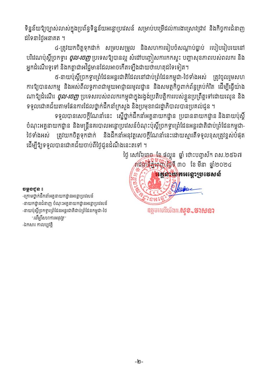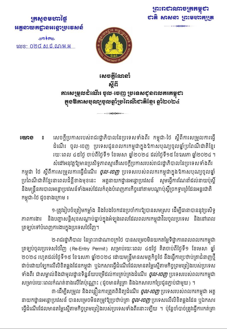 អគ្គនាយកដ្ឋានអន្តោប្រវេសន៍ ណែនាំស្តីពីការសម្រួលដំណើរ ចូល-ចេញ ប្រទេសជូនពលករកម្ពុជា ក្នុងឱកាសបុណ្យចូលឆ្នាំប្រពៃណីជាតិខ្មែរ ឆ្នាំ២០២៤