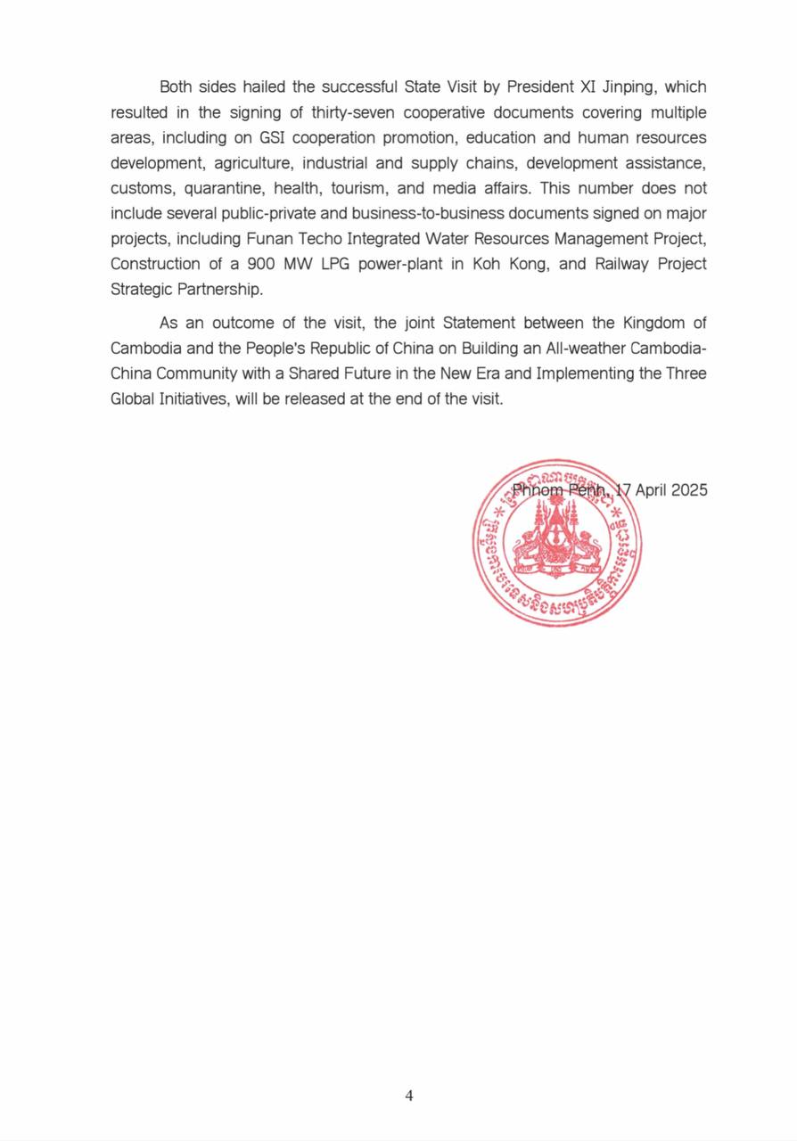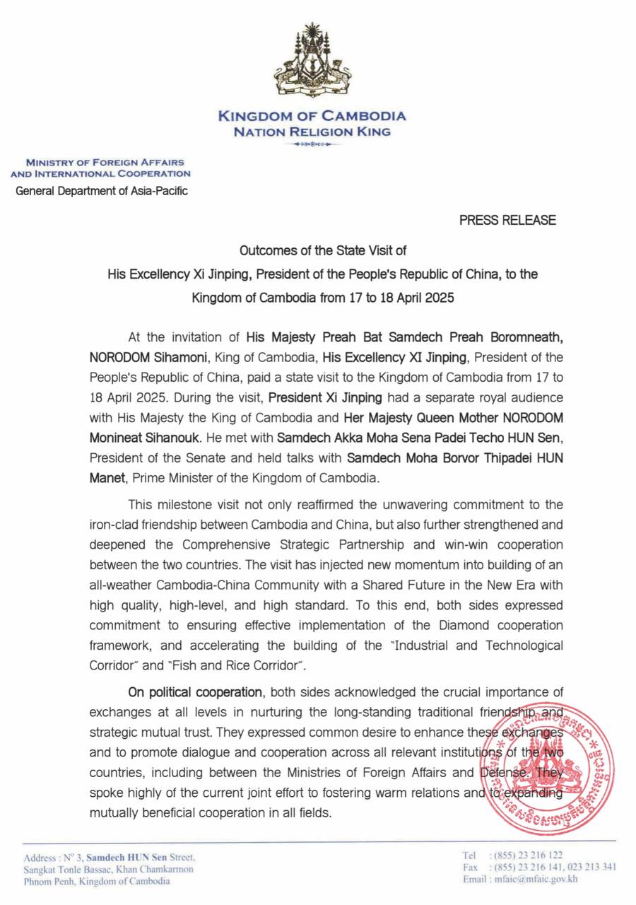 Outcomes of the State Visit of His Excellency Xi Jinping, President of the People’s Republic of China, to the Kingdom of Cambodia from 17 to 18 April 2025