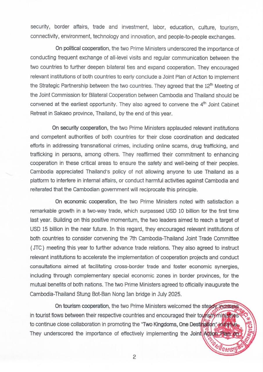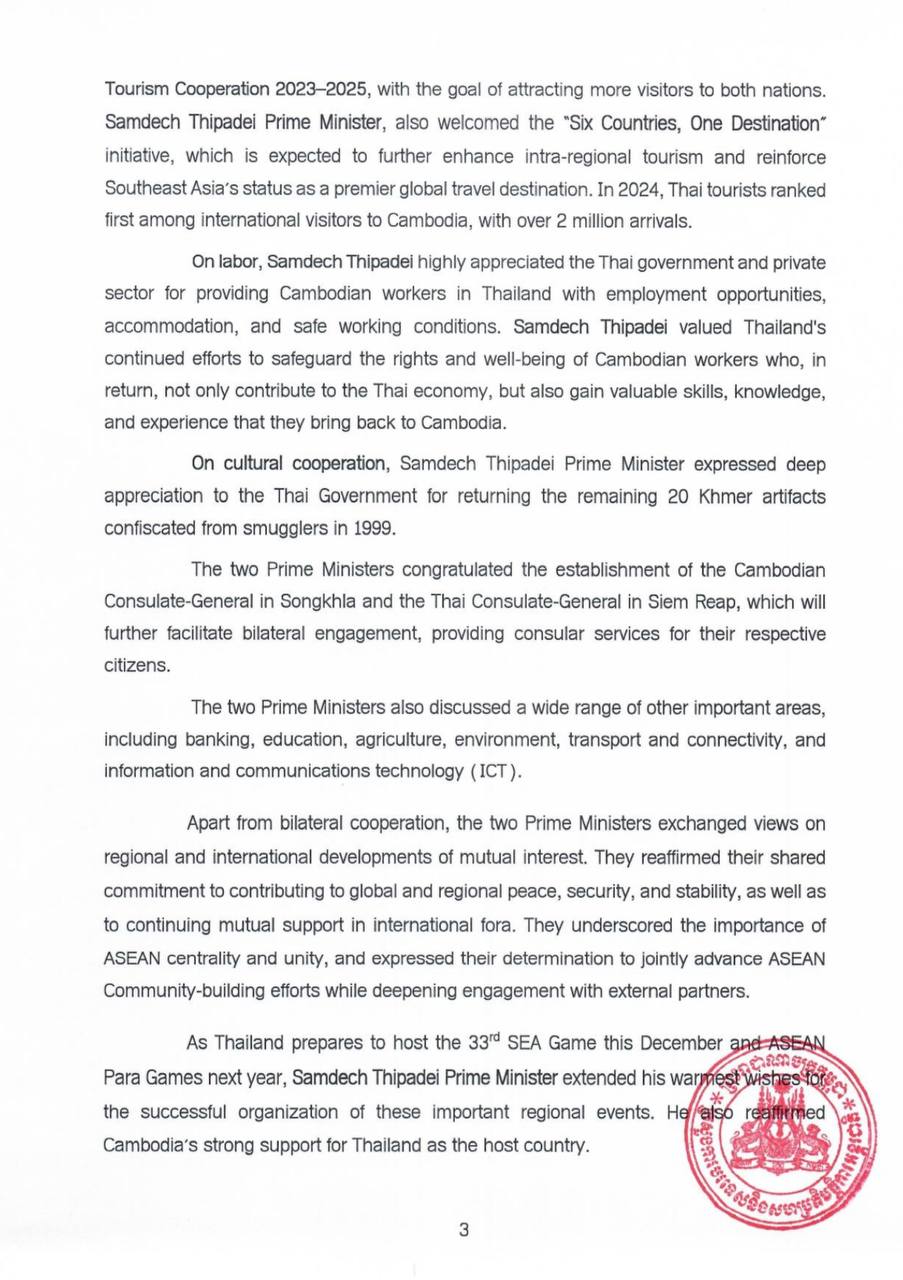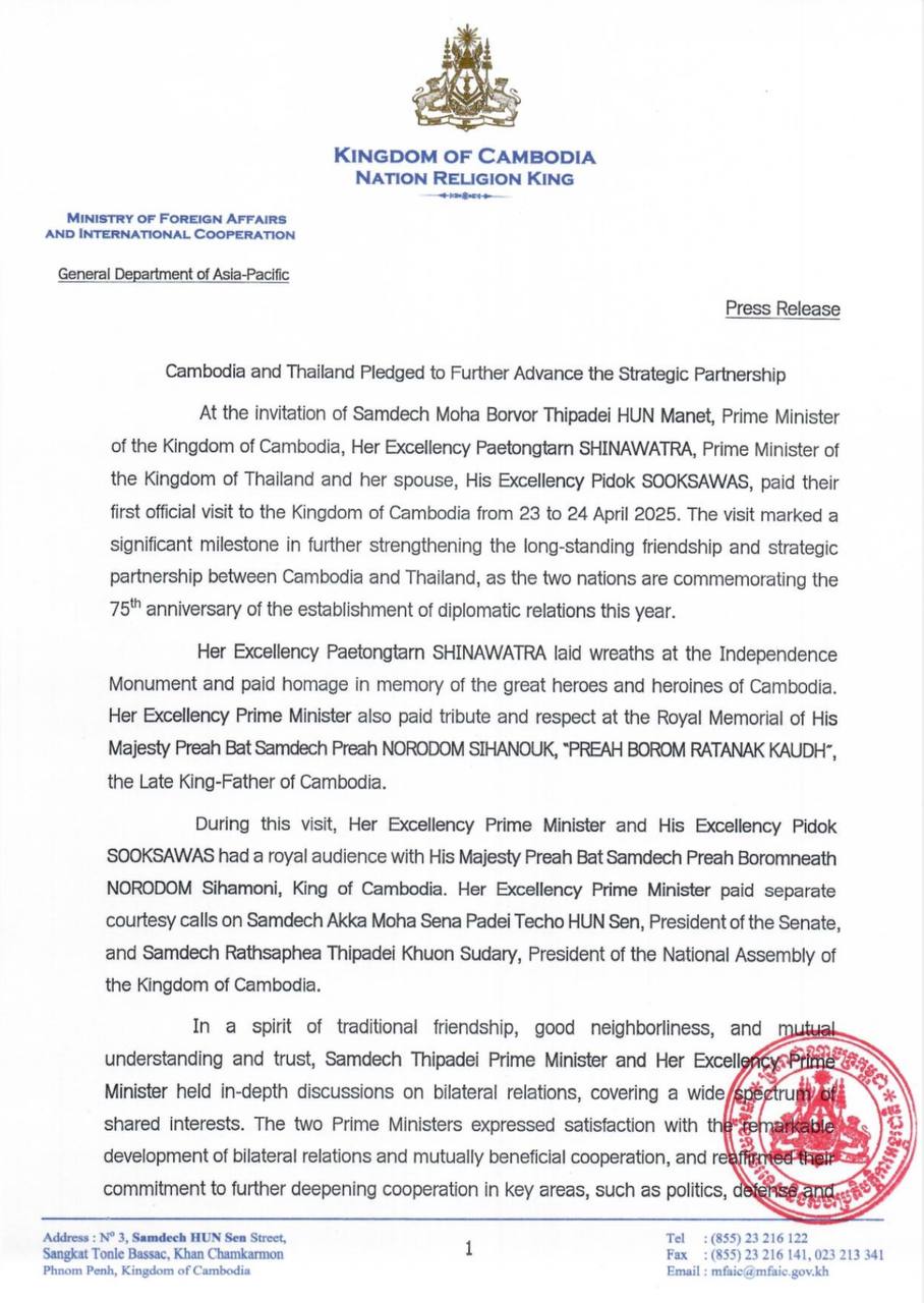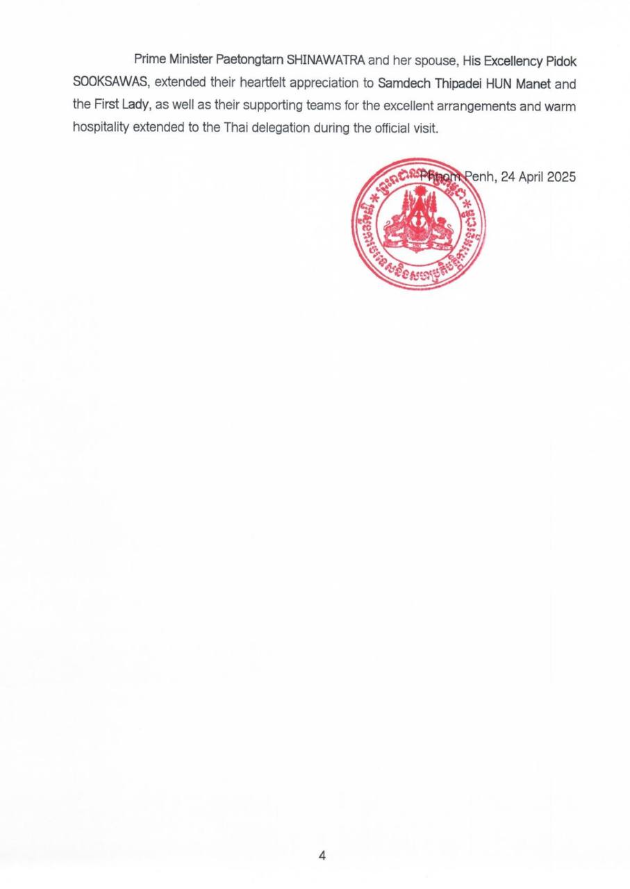Press Release on the Outcome of the Working Visit of Samdech Thipadei Prime Mini...