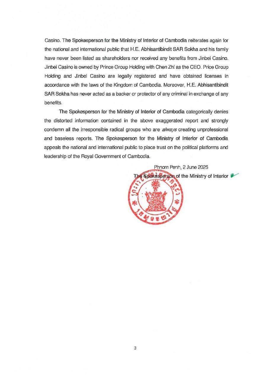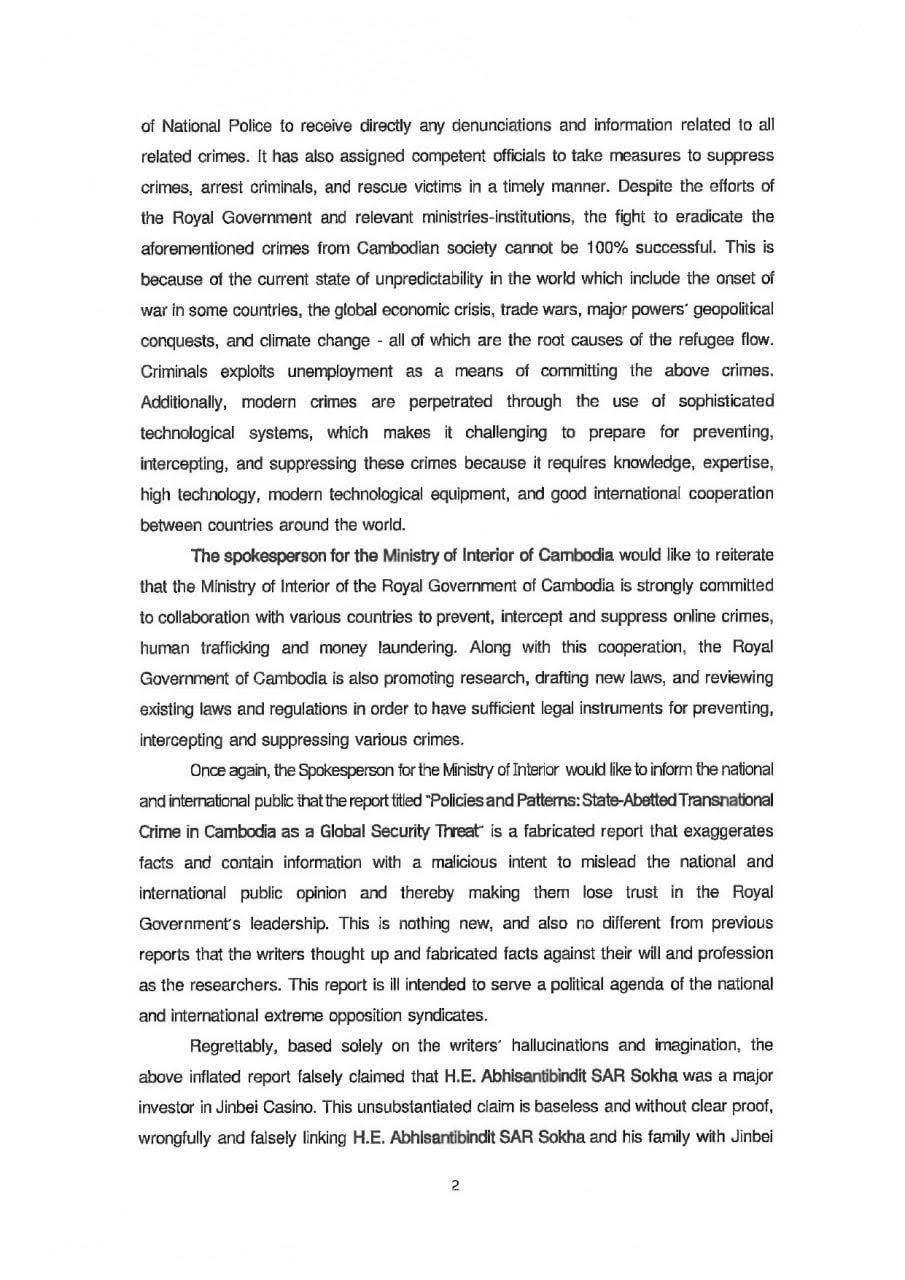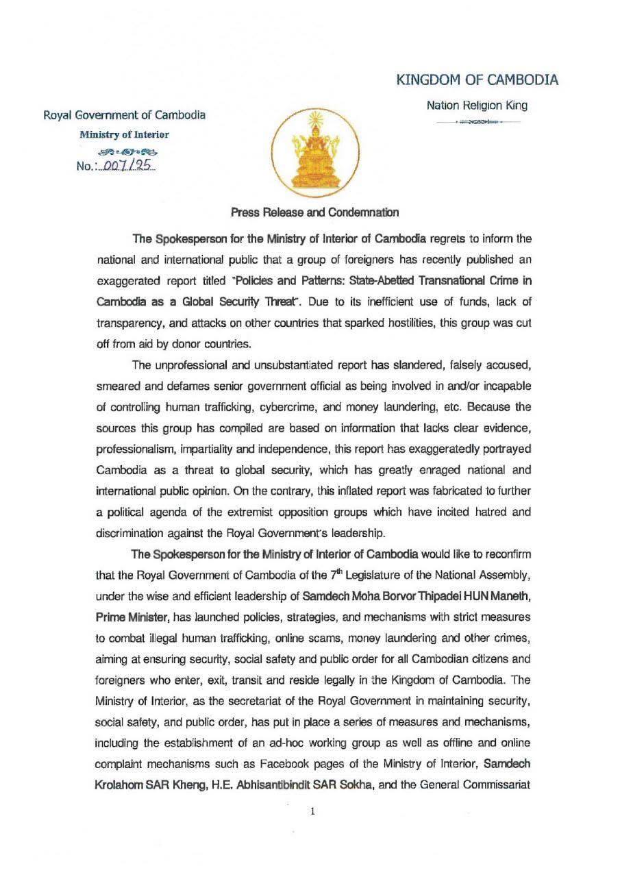 Press Release and Condemnation of the Spokesperson for the Ministry of interior of Cambodia regrets to inform the national and international public that a group of foreigners has recently published and exaggerated report titled “Policies and Patterns: State-Abetted Transnational Crime in Cambodia as a Global Security Threat”