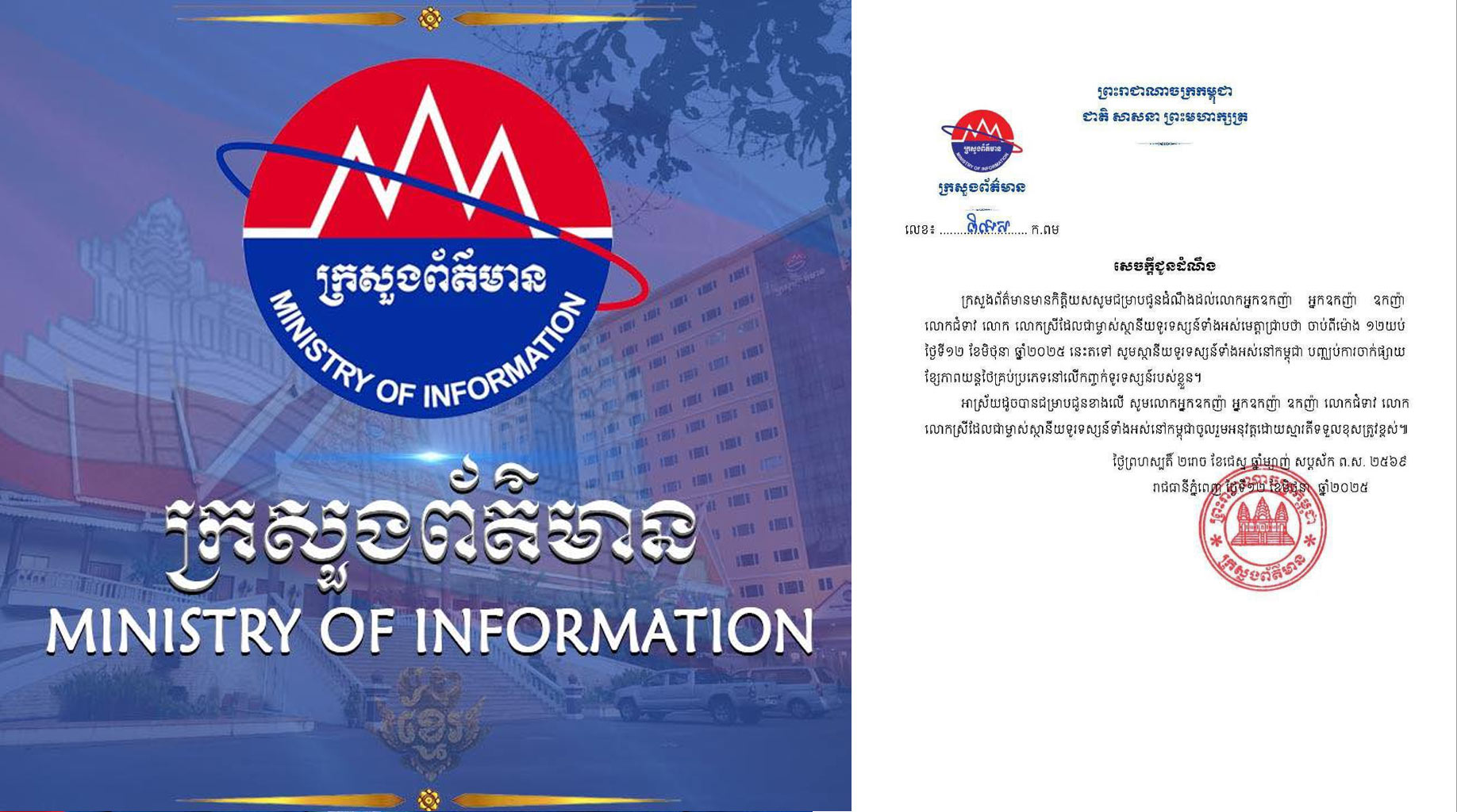 AKP Phnom Penh, June 13, 2025 — The Ministry of Information has instructed all local television stations to cease broadcasting Thai films, effective from midnight on June 12, 2025.
