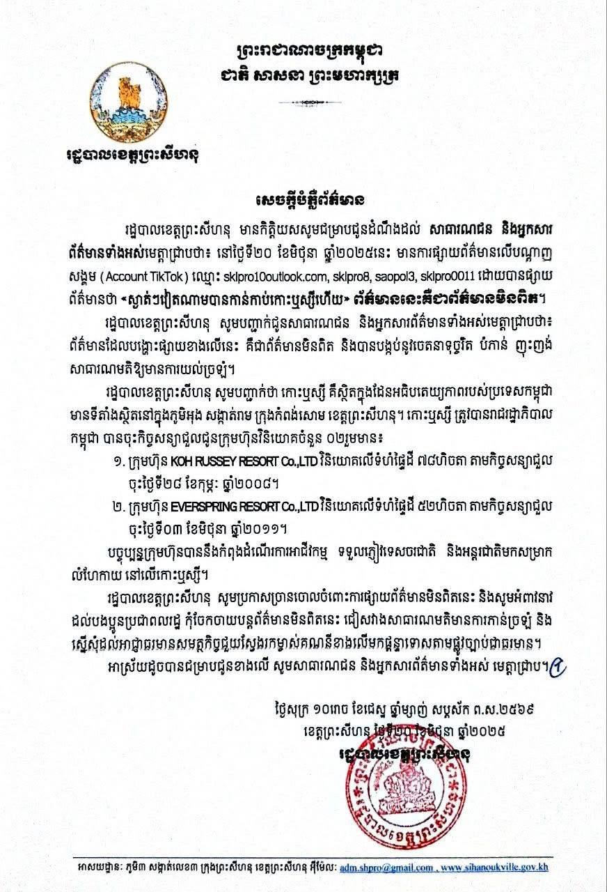 “This is fake news with malicious intent aimed at misleading public opinion,” stated the Preah Sihanouk Provincial Administration.