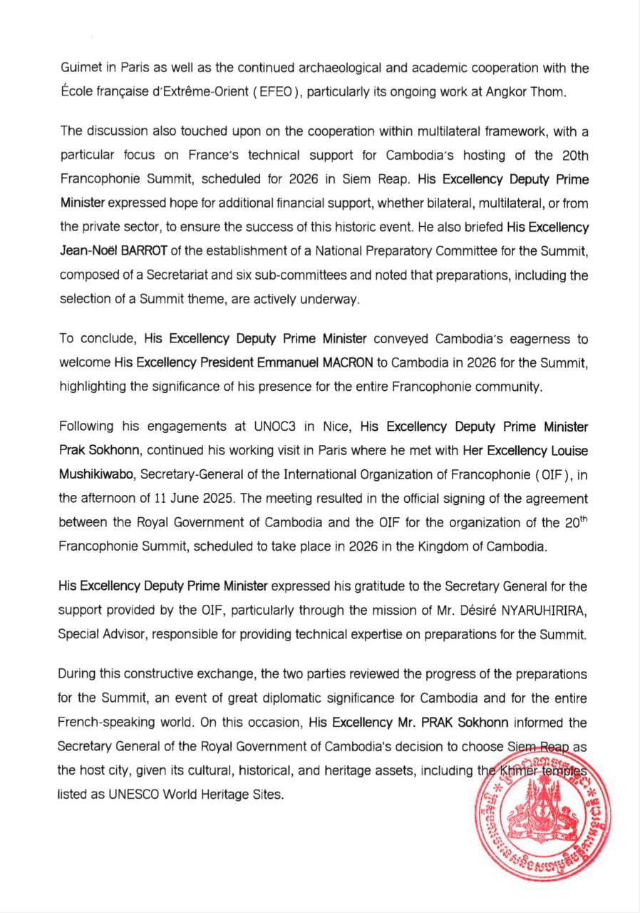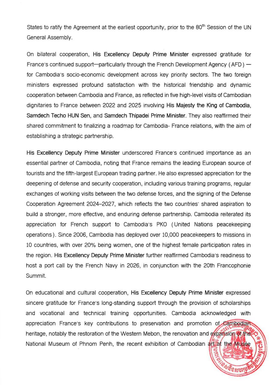 Outcomes of the working visit of His Excellency PRAK Sokhonn, Deputy Prime Minister and Minister of Foreign Affairs and International Cooperation of the Kingdom of Cambodia on the sidelines of the Third United Nations Ocean Conference