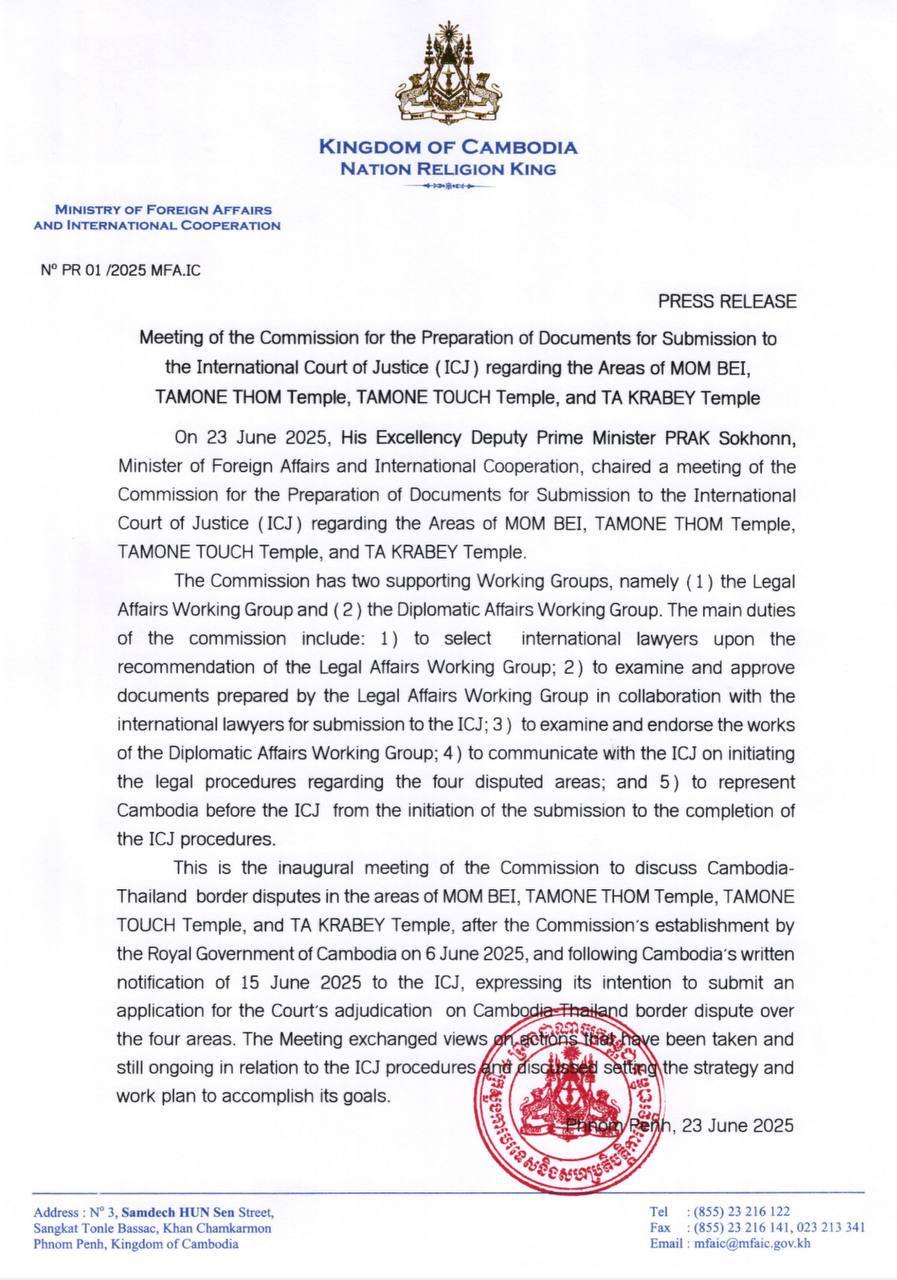 PRESS RELEASE: Meeting of the Commission for the Preparation of Documents for Submission to the International Court of Justice (ICJ) regarding the Areas of MOM BEI, TAMONE THOM Temple, TAMONE TOUCH Temple, and TA KRABEY Temple