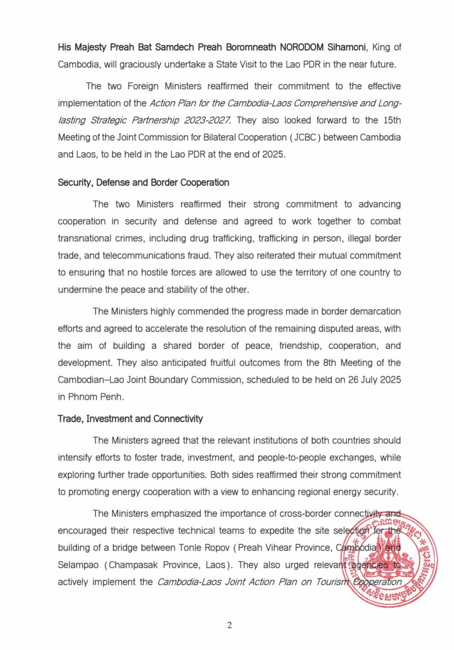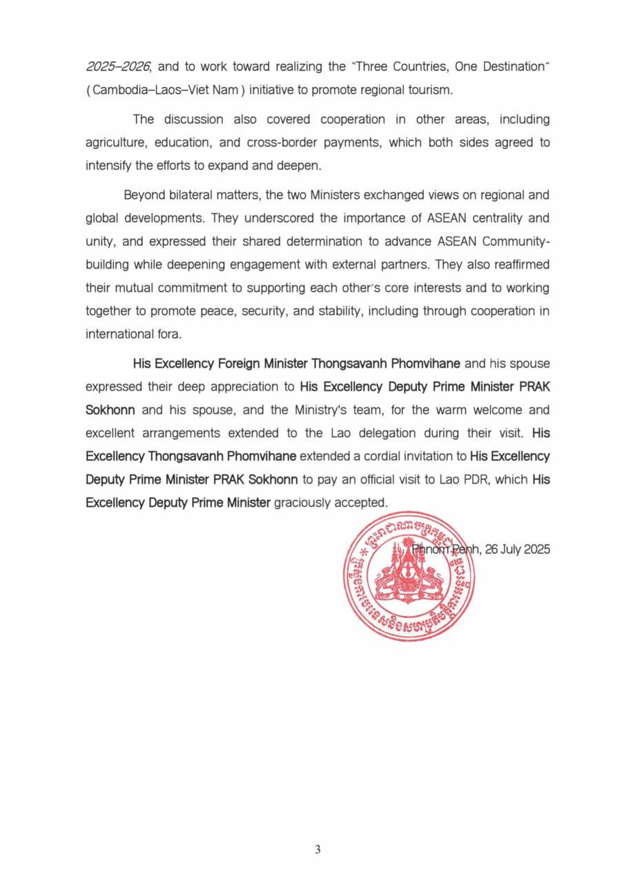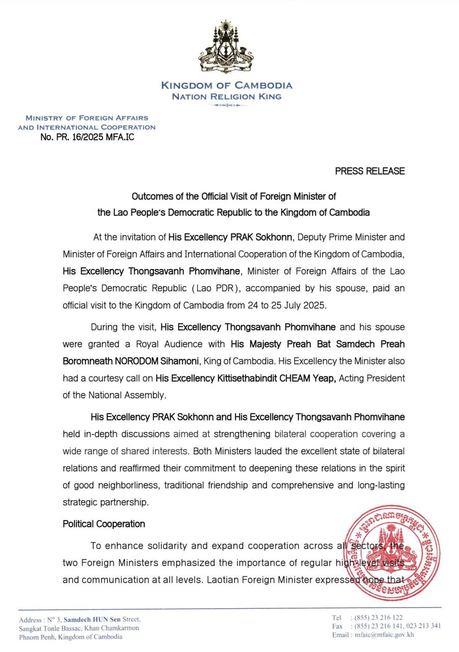 Outcomes of the Official Visit of Foreign Minister of the Lao People’s Democratic Republic to the Kingdom of Cambodia