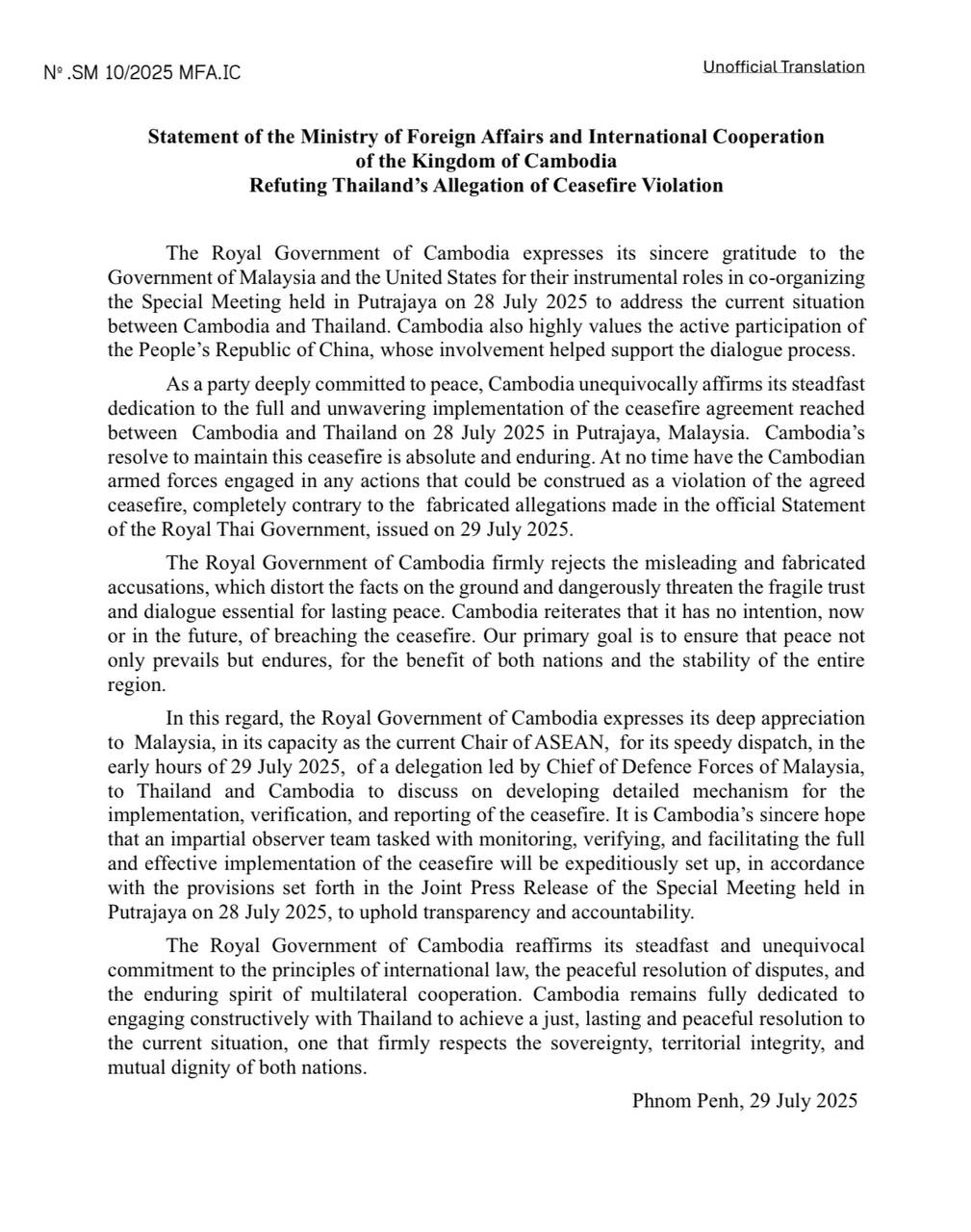 Statement of the Ministry of Foreign Affairs and International Cooperation of the Kingdom of Cambodia Refuting Thailand’s Allegation of Ceasefire Violation