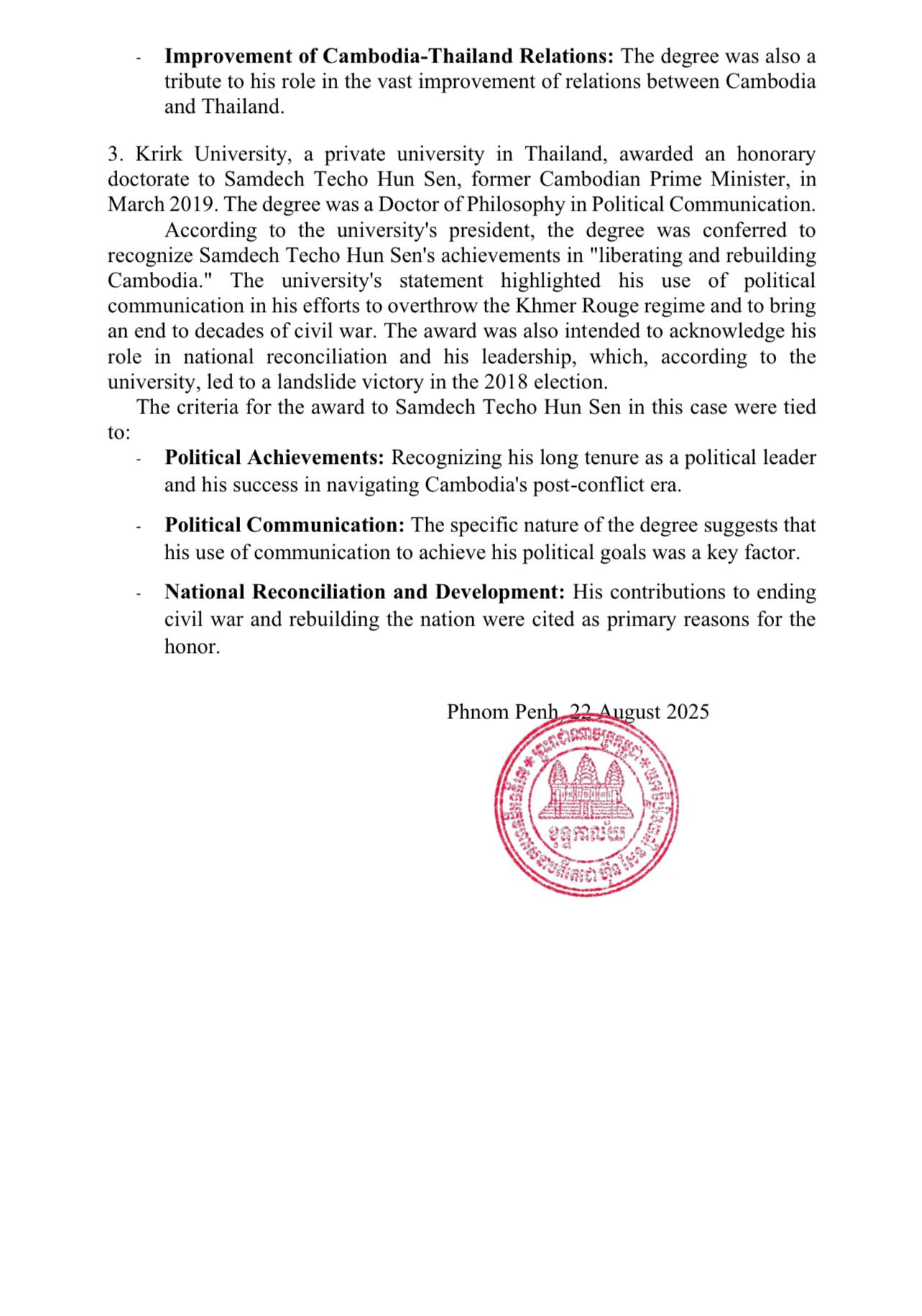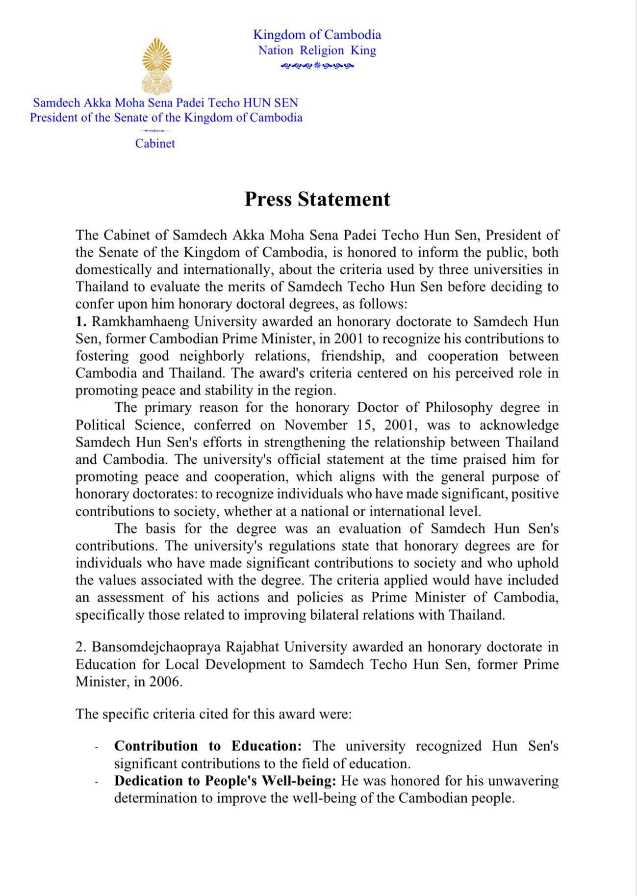 Press Statement of Cabinet of Samdech Akka Moha Sena Padei Techo HUN SEN President of the Senate of the Kingdom of Cambodia