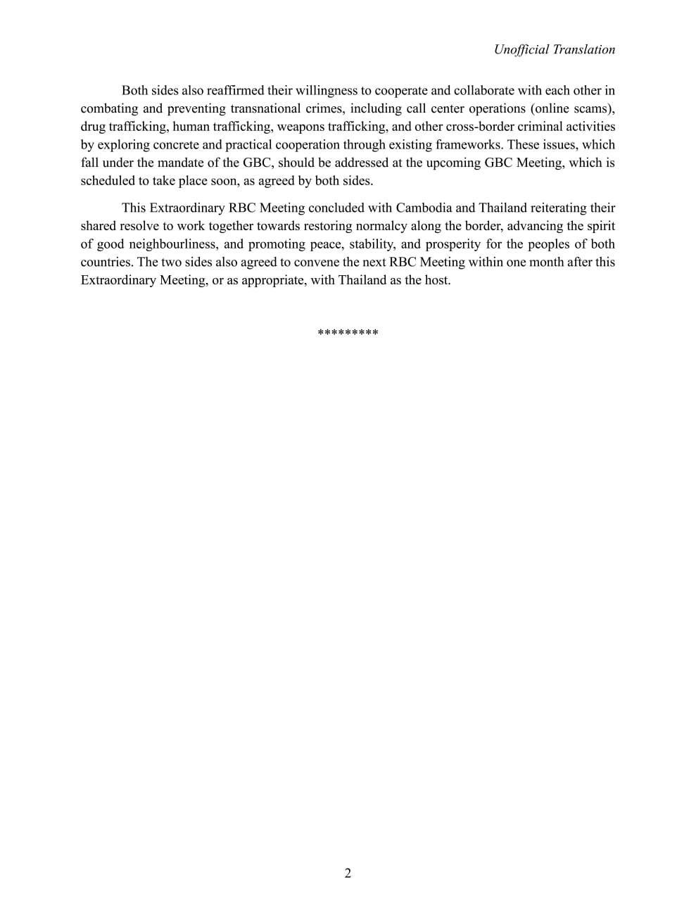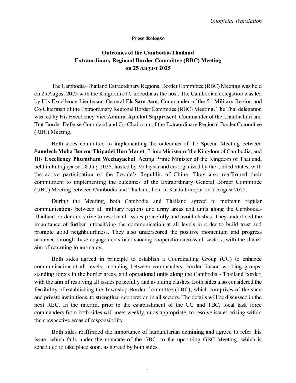 Press Release on the Outcomes of the Extraordinary Meeting of the Cambodia-Thailand Regional Border Committee (RBC) between the Military Region 5 of Cambodia and the Chanthaburi-Trat Border Defence Command of Thailand held on 25 August 2025, with Cambodia as the host.