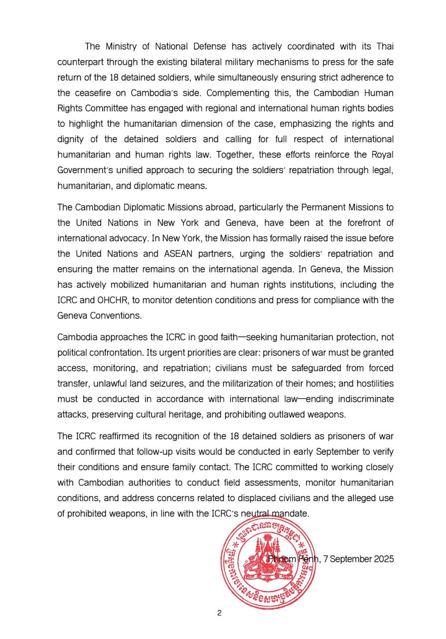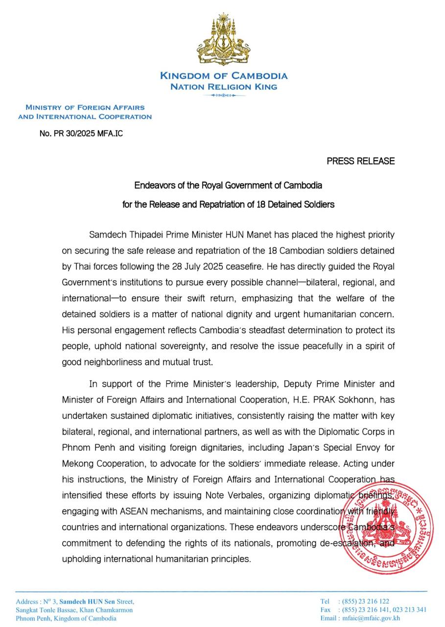 Press Release of Ministry of Foreign Affairs and International Cooperation of Endeavors of the Royal Government of Cambodia for the Release and Repatriation of 18 Detained Soldiers