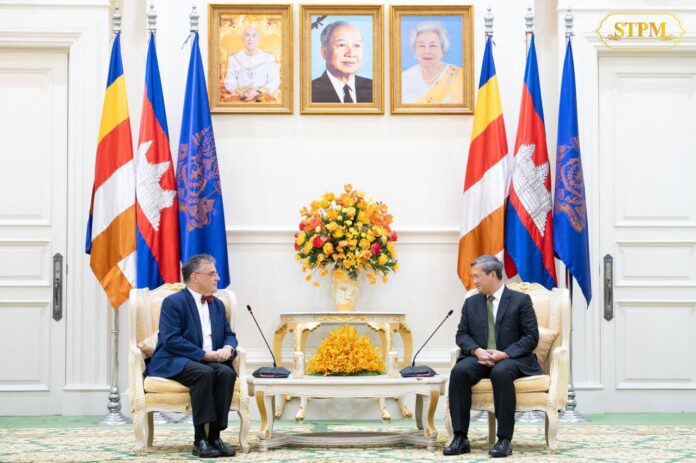 On the morning of 19 September 2025, Samdech Moha Borvor Thipadei HUN Manet, Prime Minister of the Kingdom of Cambodia, received a courtesy call from His Excellency Olivier RICHARD, Ambassador Extraordinary and Plenipotentiary of the French Republic to the Kingdom of Cambodia, at the Peace Palace.