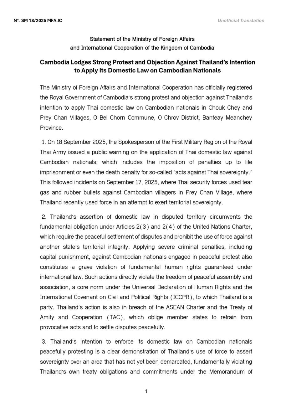 Statement of the Ministry of Foreign Affairs and International Cooperation of the Kingdom of Cambodia on Cambodia Lodges Strong Protest and Objection Against Thailand’s Intention to Apply Its Domestic Law on Cambodian Nationals
