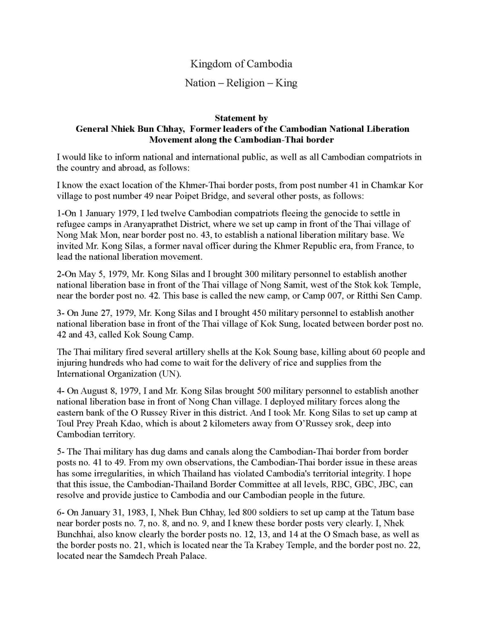 Statement by General Nhiek Bun Chhay, Former leaders of the Cambodian National Liberation Movement along the Cambodian-Thai border