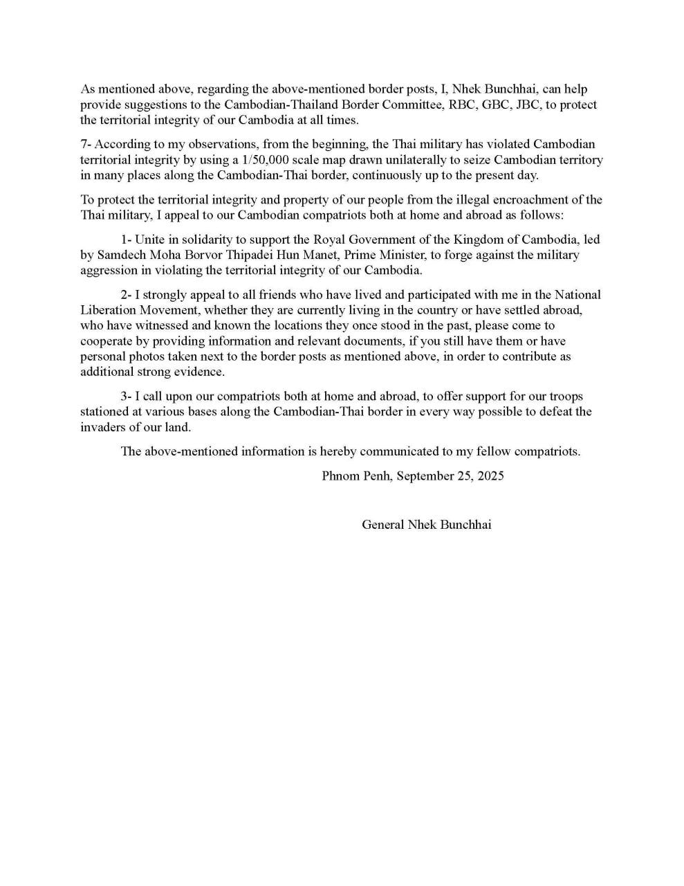 As mentioned above, regarding the above-mentioned border posts, I, Nhek Bunchhai, can help provide suggestions to the Cambodian-Thailand Border Committee, RBC, GBC, JBC, to protect the territorial integrity of our Cambodia at all times.