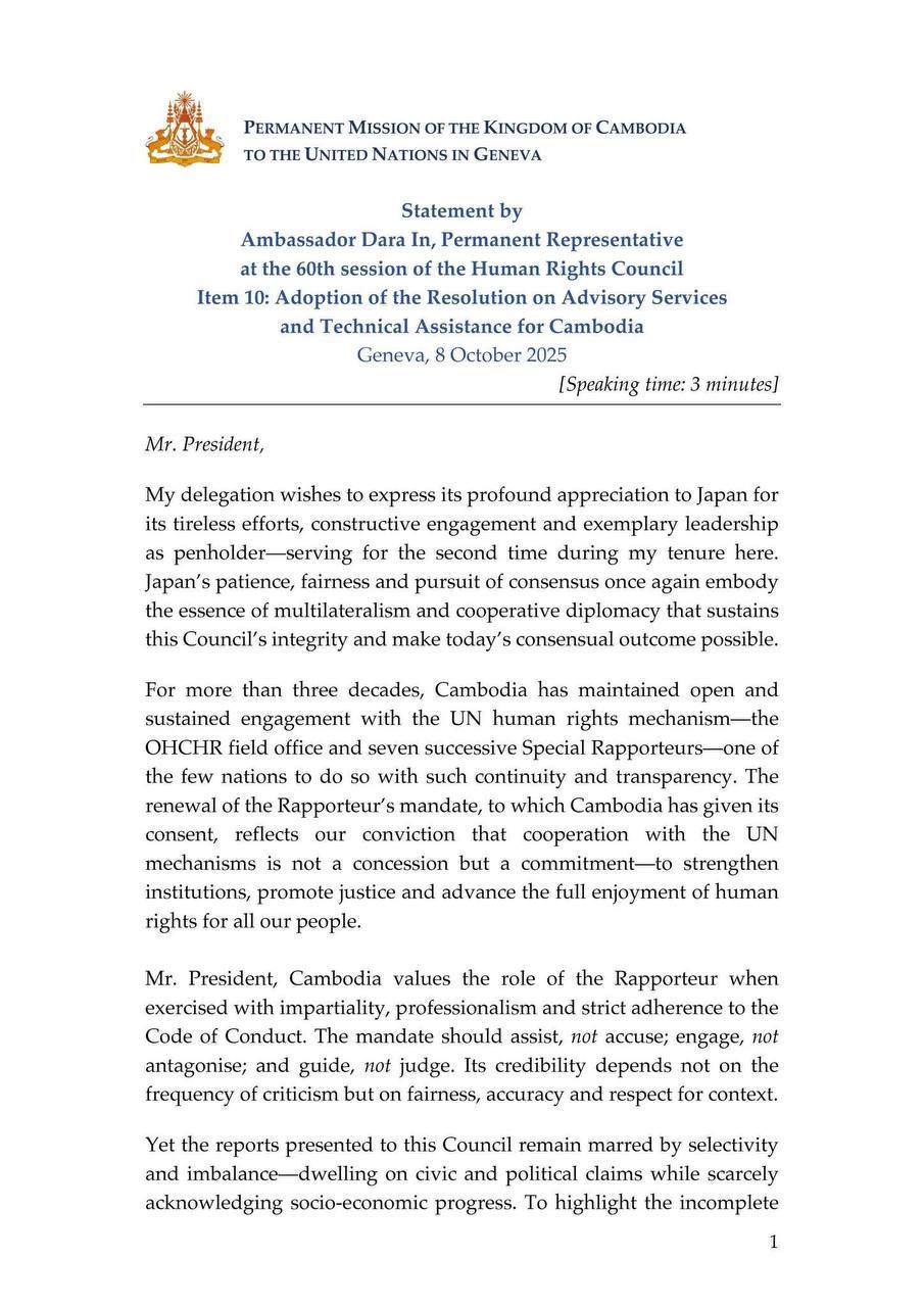 Ambassador Dara In, Permanent Representative at the 60th session of the Human Rights Council Item 10 : Adoption of the Resolution on Advisory Services and Technical Assistance for Cambodia