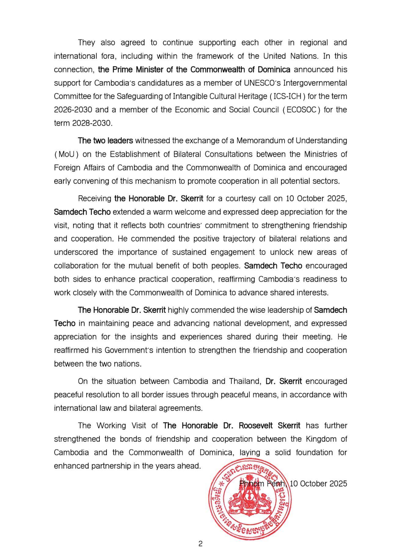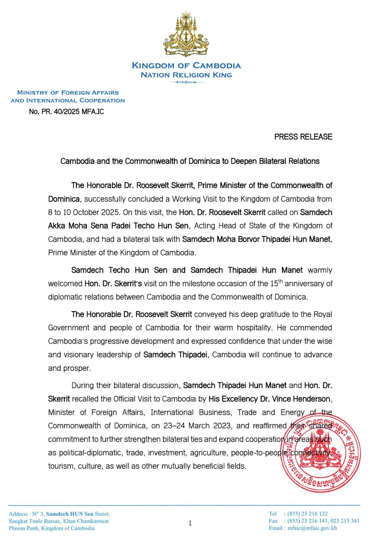Press Release of Ministry of Foreign Affairs and International Cooperation “Cambodia and the Commonwealth of Dominica to Deepen Bilateral Relations”