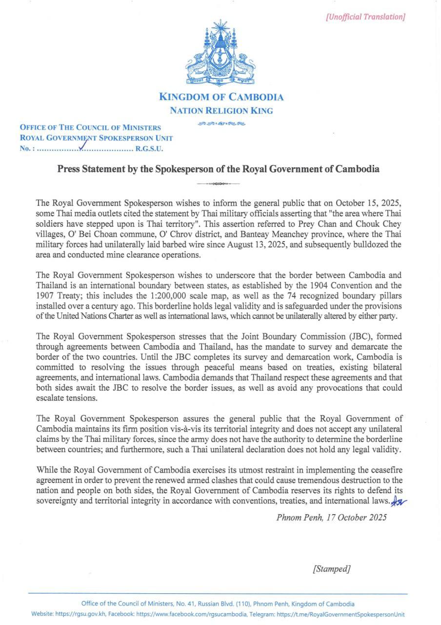 Press Statement by the Spokesperson of the Royal Government of Cambodia wishes to inform the general public that on October 15, 2025, some Thai media outlets cited the statement by Thai military officials asserting that “the area where Thai soldiers have stepped upon is Thai territory”. This assertion referred to Prey Chan and Chouk Chey villages, O’ Bei Choan commune, O’ Chrov district, and Banteay Meanchey province, where the Thai military forces had unilaterally laid barbed wire since August 13, 2025, and subsequently bulldozed the area and conducted mine clearance operations.