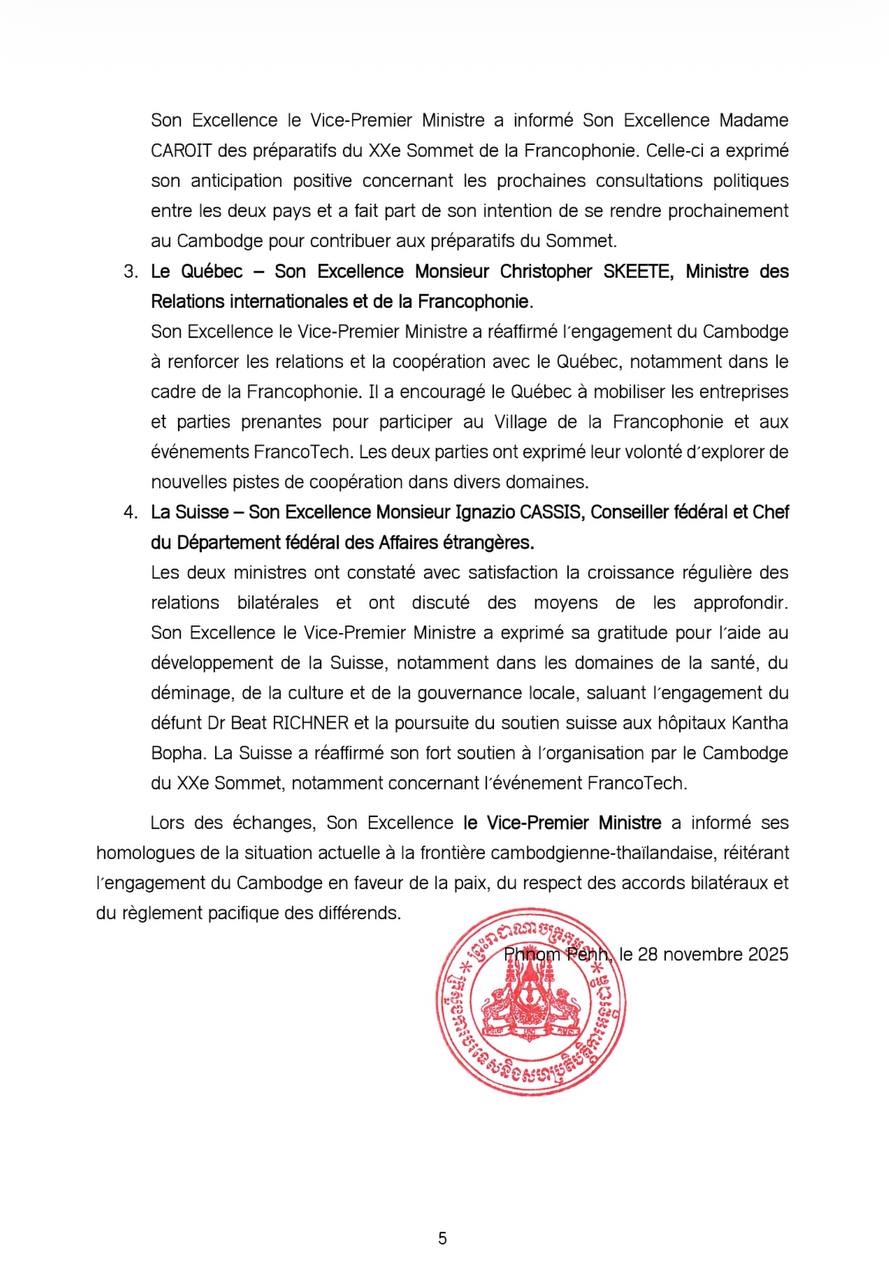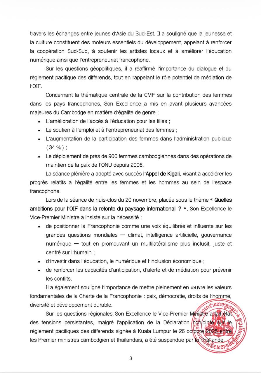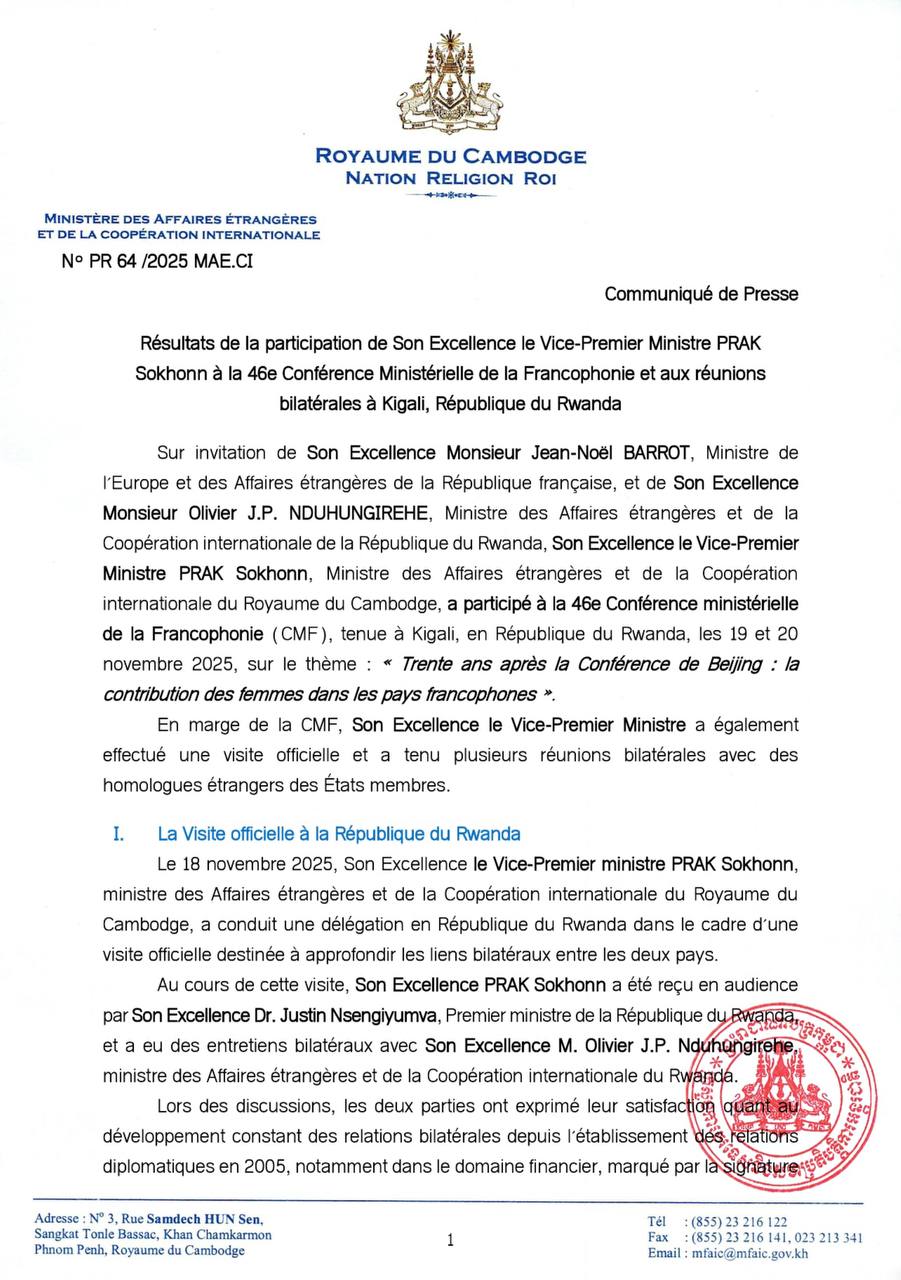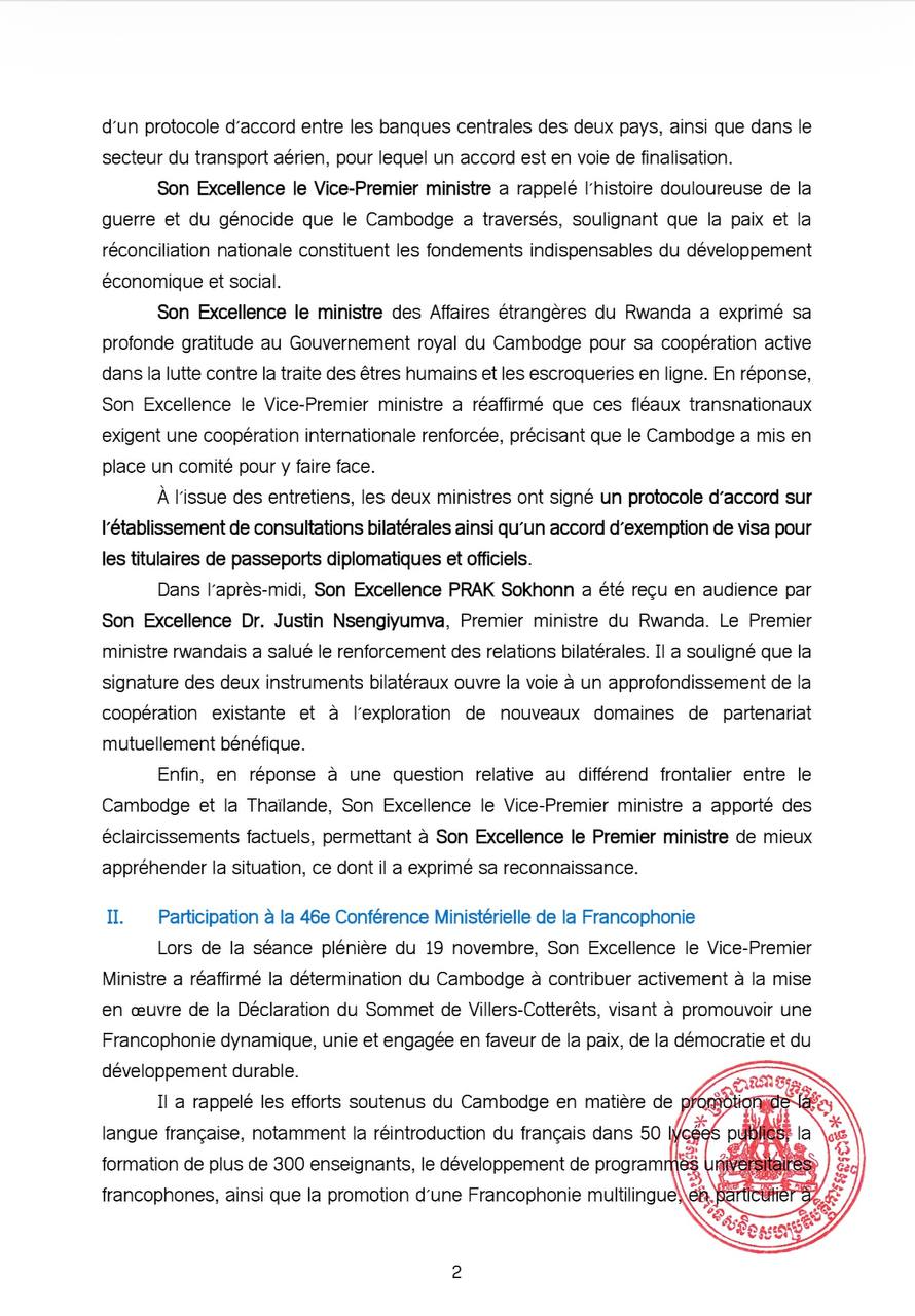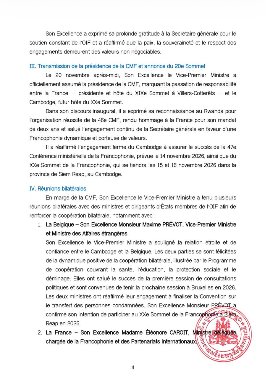 Résultats de la participation de Son Excellence le Vice-Premier Ministre PRAK Sokhonn à la 46e Conférence Ministérielle de la Francophonie et aux réunions bilatérales à Kigali, République du Rwanda