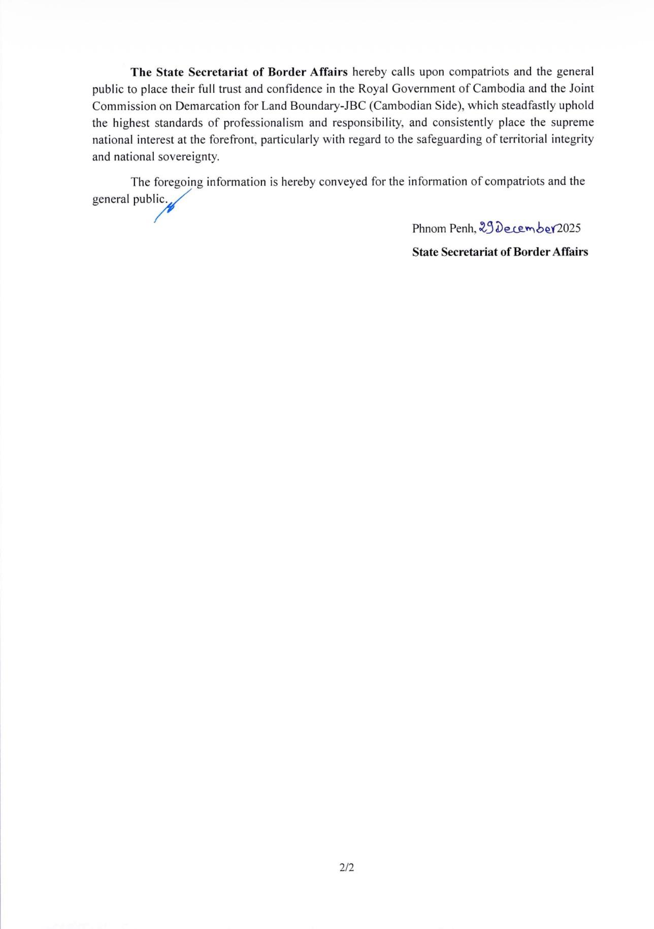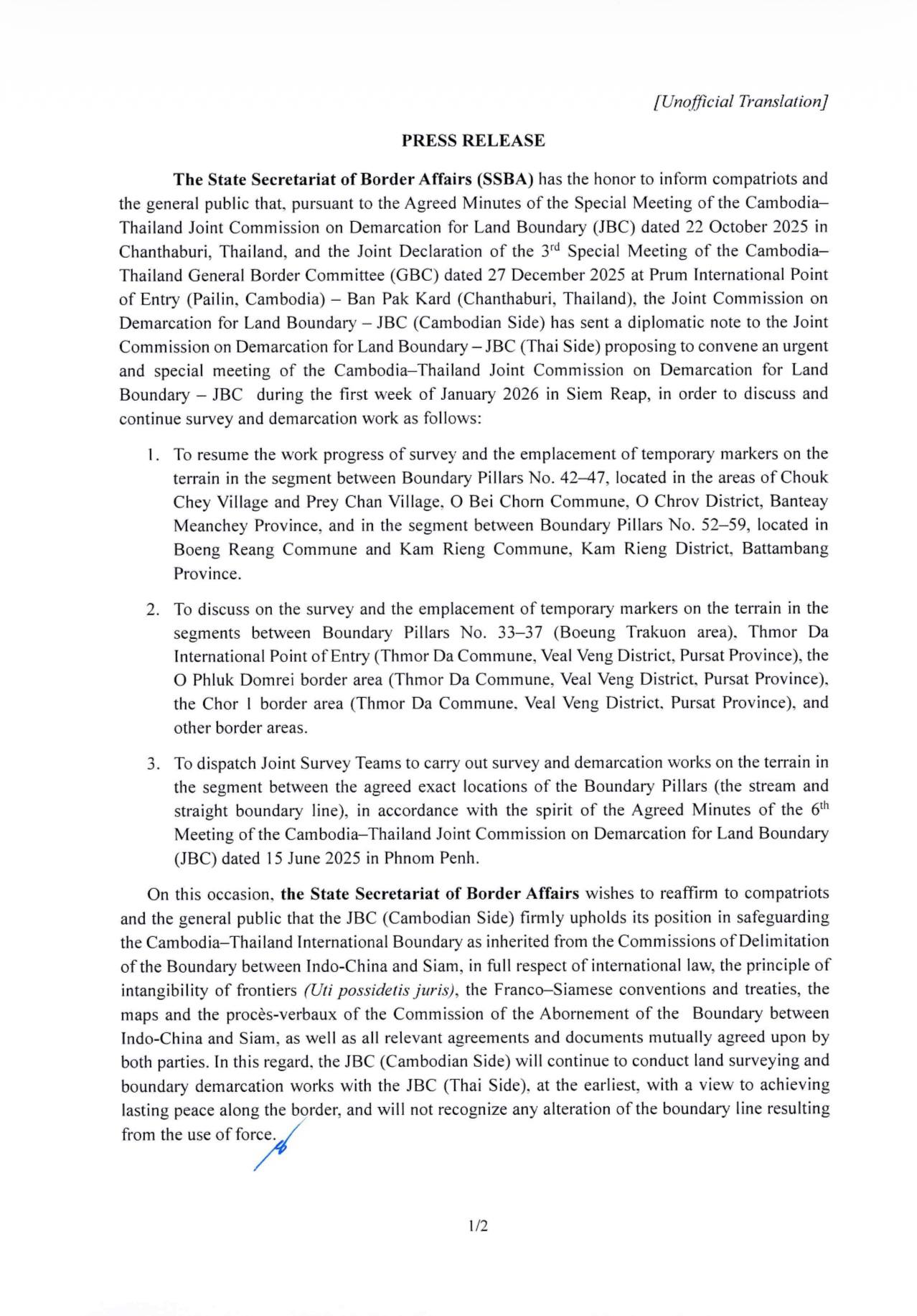 The State Secretariat of Border Affairs (SSBA) | The Joint Commission on Demarcation for Land Boundary – JBC (Cambodian Side) has sent a diplomatic note to the Joint Commission on Demarcation for Land Boundary – JBC (Thai Side) proposing to convene an urgent and special meeting of the Cambodia-Thailand Joint Commission on Demarcation for Land Boundary – JBC during the first week of January 2026 in Siem Reap, in order to discuss and continue survey and demarcation work.