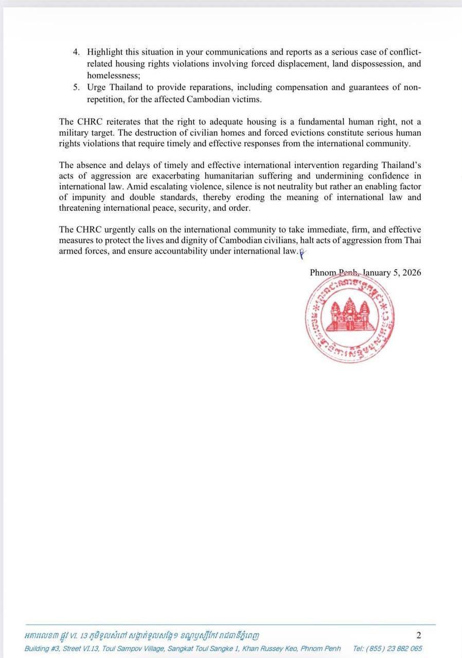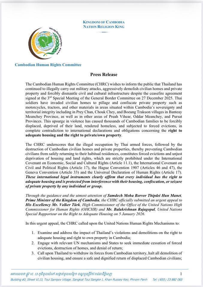 Cambodian Human Rights Committee | Thailand has continued to illegally carry out military attacks, aggressively demolish civilian homes and private property and forcibly dismantle civil and cultural infrastructure despite the ceasefire agreement signed at the 3rd Special Meeting of the General Border Committee on 27 December 2025.