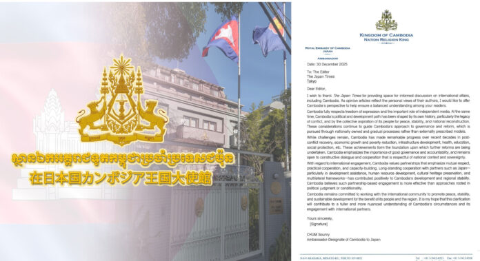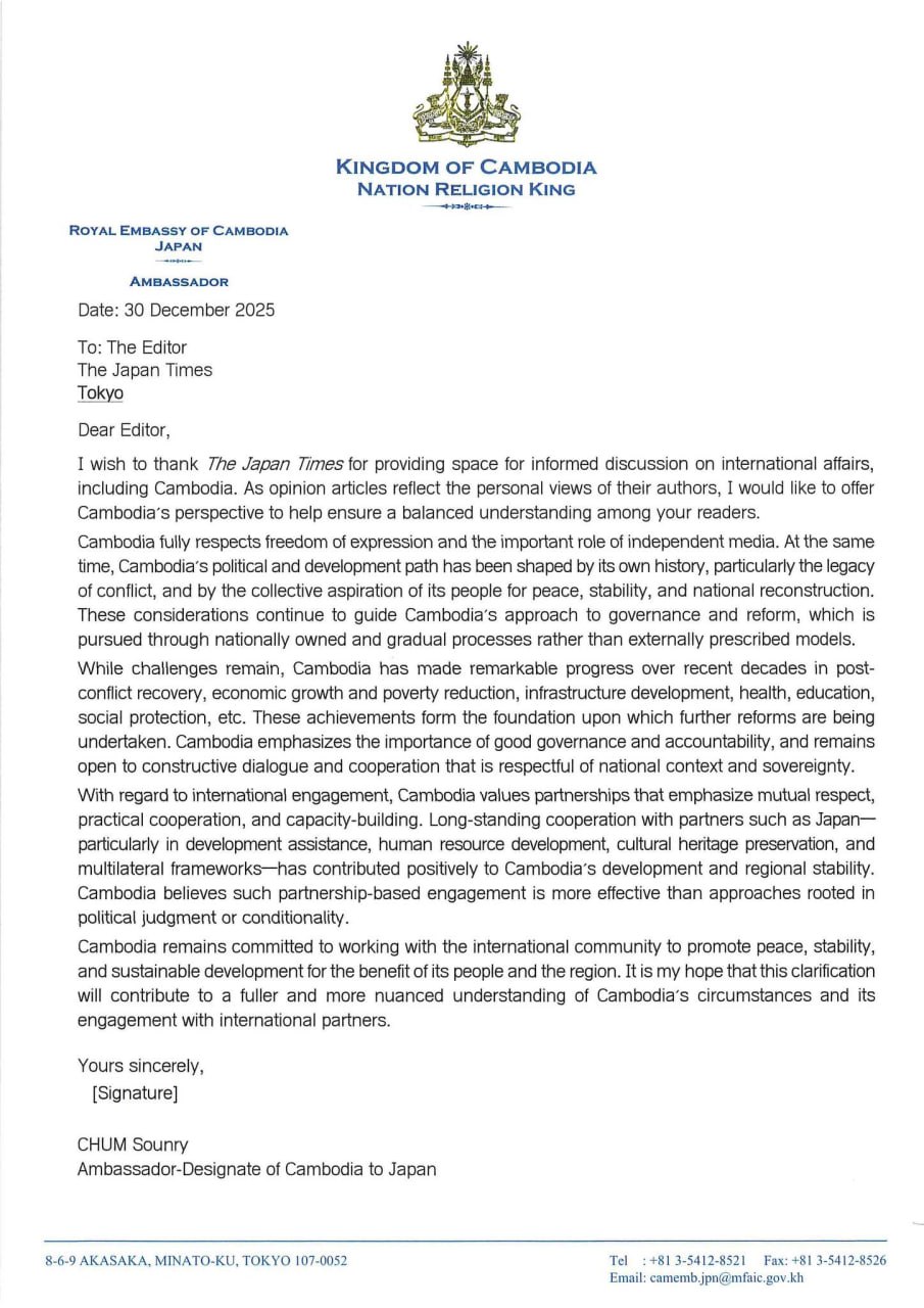 In response to the article published by The Japan Times titled “The World Is Failing Cambodia (Again) – and This Time Everyone Is Suffering,” dated 29 December 2025, the Royal Embassy of Cambodia to Japan provided a clarification letter to the Editor of The Japan Times on 30 December 2025, regarding the Cambodia’s perspective to ensure a balanced and understanding among the public.