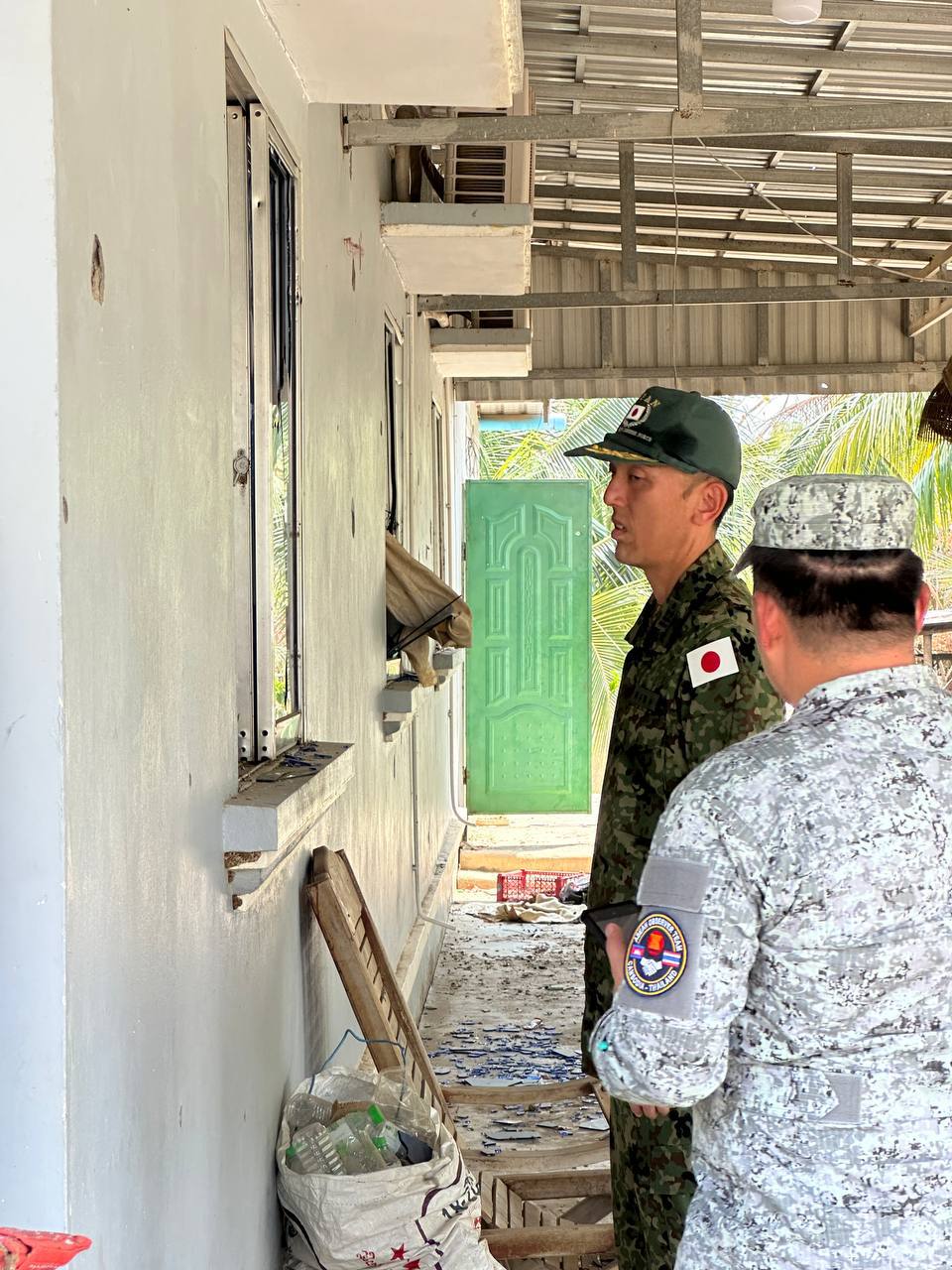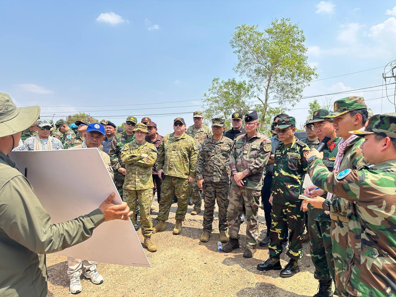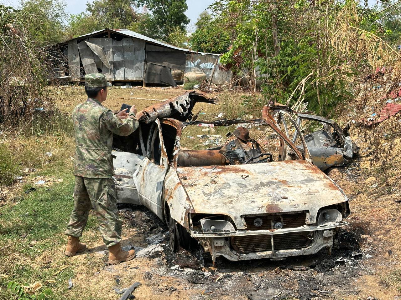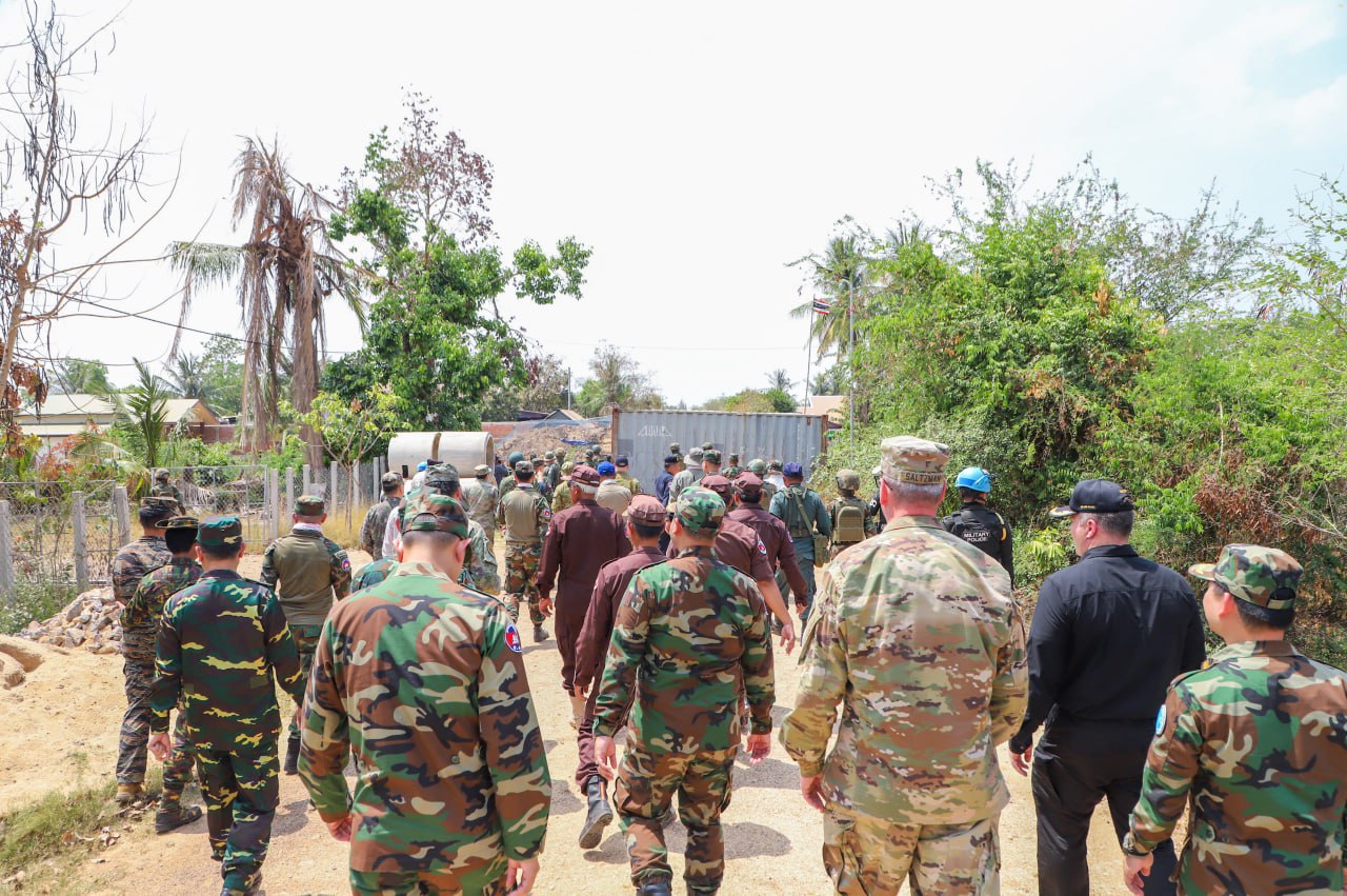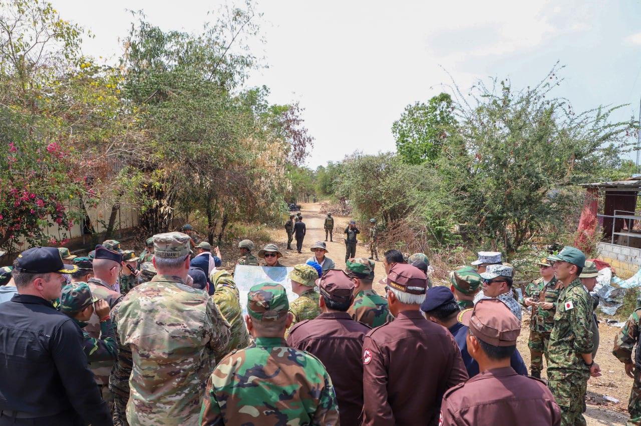 On Wednesday, March 4, 2026, at 1:00 p.m., the Ministry of National Defence of the Kingdom of Cambodia coordinated with delegations of foreign military attachés to the Kingdom of Cambodia from 12 countries to inspect the actual location in Prey Chan Village, O’ Bei Choan Commune, O’ Chrov District, Banteay Meanchey Province. The visit aimed to observe the site of the attack, the barbed wire installation, the illegal installation of shipping containers by the Thai military, and to assess the status of the implementation of the ceasefire between Cambodia and Thailand, which came into effect at 12:00 p.m. on December 27, 2025.