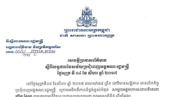 សេចក្តីប្រកាសព័ត៌មាន ស្តីពីលទ្ធផលនៃសម័យប្រជុំពេញអង្គគណៈរដ្ឋមន្ត្រី ថ្ងៃសុក្រ ទី ០៤ ខែ សីហា ឆ្នាំ ២០១៧