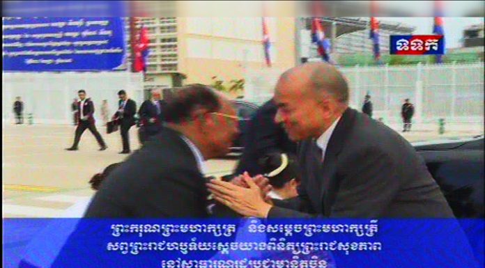 ព្រះករុណាព្រះបាទសម្ដេចព្រះបរមនាថ នរោត្ដម សីហមុនី ព្រះមហាក្សត្រ នៃព្រះរាជាណាចក្រកម្ពុជា និងសម្ដេចព្រះមហាក្សត្រី នរោត្ដម មុនីនាថ សីហនុ ព្រះវររាជមាតាជាតិខ្មែរ ក្នុងសេរីភាព សេចក្ដីថ្លៃថ្នូរ