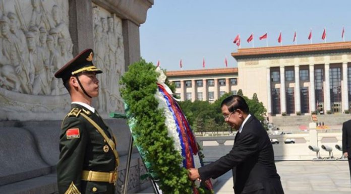 នៅព្រឹកថ្ងៃទី ១៦ ខែ ឧសភា ដដែលនេះ បន្ទាប់ពីបានដាក់កម្រងផ្កាគោរពវិញ្ញាណក្ខន្ឋនៅវិមានវិរៈជនរបស់ប្រជាជនចិនរួចហើយ សម្តេចអគ្គមហាសេនាបតីតេជោ ហ៊ុន សែន នាយករដ្ឋមន្រ្តីនៃព្រះរាជាណាចក្រកម្ពុជា បាន