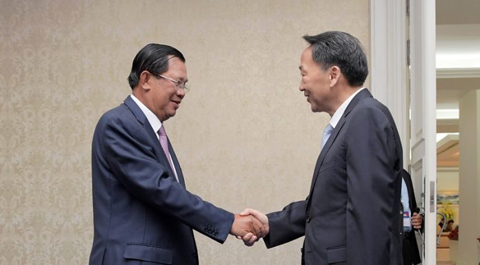 សម្តេចតេជោ ហ៊ុន សែន នាយករដ្ឋមន្ត្រីនៃព្រះរាជាណាចក្រកម្ពុជា បានទទួលជួបសវនាការជាមួយលោក ជាំង ជៀកៅ (Jiang Jiauguo) សមាជិកបក្សកុម្មុយនីស្តចិន