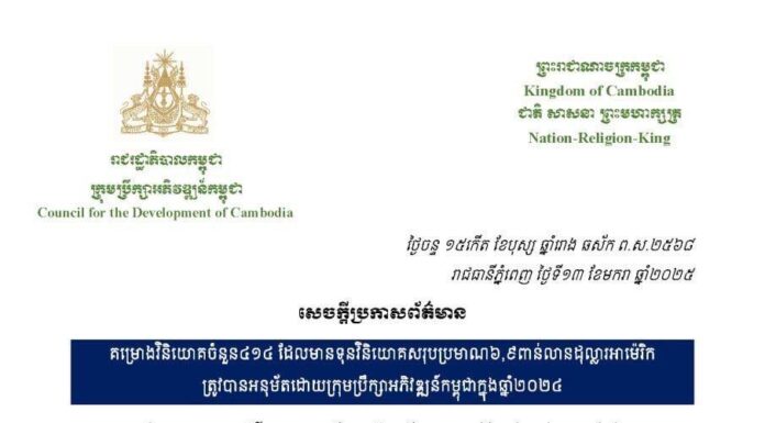 គម្រោងវិនិយោគចំនួន ៤១៤ ដែលមានទុនវិនិយោគសរុបប្រមាណ ៦,៩ពាន់លានដុល្លារអាម៉េរិក ត្រូវបានអនុម័តដោយក្រុមប្រឹក្សាអភិវឌ្ឍន៍កម្ពុជា ក្នុងឆ្នាំ២០២៤