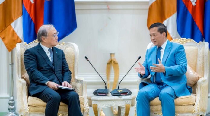 សម្តេចមហាបវរធិបតី ហ៊ុន ម៉ាណែត នាយករដ្ឋមន្ត្រី នៃព្រះរាជាណាចក្រកម្ពុជា បានអនុញ្ញាតឱ្យ ឯកឧត្តម AKIBA Takeo ទីប្រឹក្សាសន្តិសុខជាតិជប៉ុន ចូលជួបសម្តែងការគួរសម និងពិភាក្សាការងារ នៅវិមានសន្តិភាព។