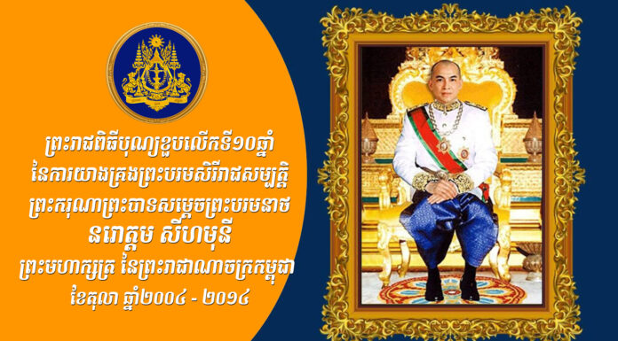 កម្រងឯកសារ ព្រះរាជសកម្មភាព អបអរសាទរ ព្រះរាជពិធីបុណ្យខួបលើកទី១០ឆ្នាំ នៃការយាងគ្រងព្រះបរមសិរីរាជសម្បត្តិ ព្រះករុណាព្រះបាទសម្តេចព្រះបរមនាថ នរោត្តម សីហមុនី ព្រះមហាក្សត្រ នៃព្រះរាជាណាចក្រកម្ពុជា ខែតុលា ឆ្នាំ២០០៤ - ២០១៤