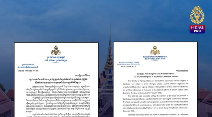 ថ្ងៃនេះ អ្នកនាំពាក្យរាជរដ្ឋាភិបាលសូមជម្រាបជូនបងប្អូនជនរួមជាតិជ្រាបអំពីការតវ៉ាថ្មីៗទៀតរបស់កម្ពុជា ប្រឆាំងនឹងសកម្មភាពរបស់ភាគីថៃ នៅក្នុងទីតាំងដែលខ្លួនដណ្តើមកាន់កាប់ដោយកម្លាំងយោធាក្នុងដែនអធិបតេយ្យរបស់កម្ពុជា